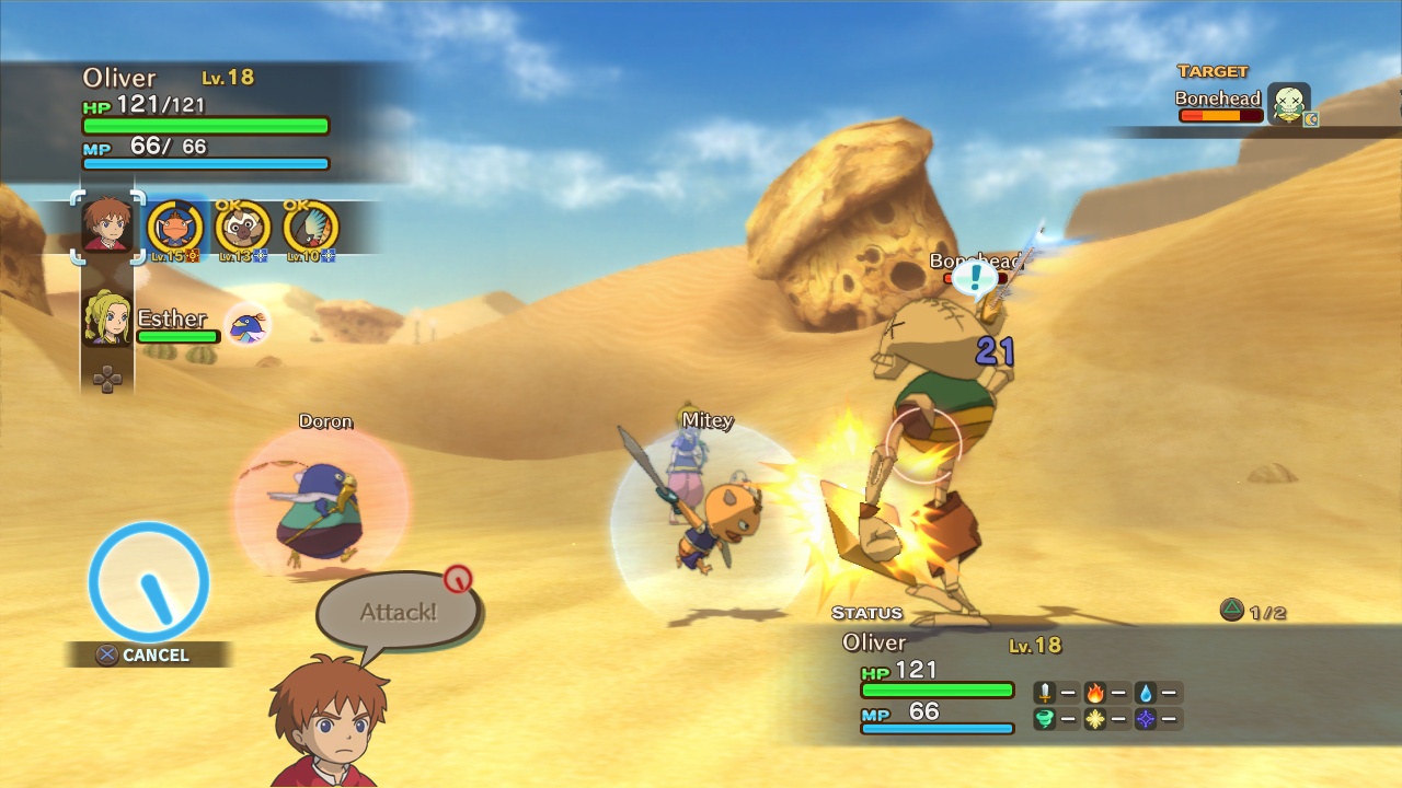A játékmenet lényeges eleme a sok dialógussal megtöltött kalandozás mellett a különböző kreatúrákkal való csatázás. Oliver és később csatlakozó két társa különböző lények segítségével tudják felvenni a harcot a változatos ellenfelekkel. Karakterenként egyszerre három, a Pokémon állatkáihoz hasonló csatlósunk lehet, akik különböző tulajdonságokkal rendelkeznek. Egyesek jobbak a közelharcban, mások a mágiában jártasak. A csaták során ugyanúgy fejlődnek, mint főhőseink, így idővel újabb képességeket szereznek, és egyre jobb felszereléssel ruházhatjuk fel őket. Oliver a mágus szerepét tölti be, a küzdelem során sokszor lesz szükség támadó és gyógyító varázslataira. A csaták közben Drippy is segít minket a bizonyos időközönként bedobált mana- és életerőgömbökkel.