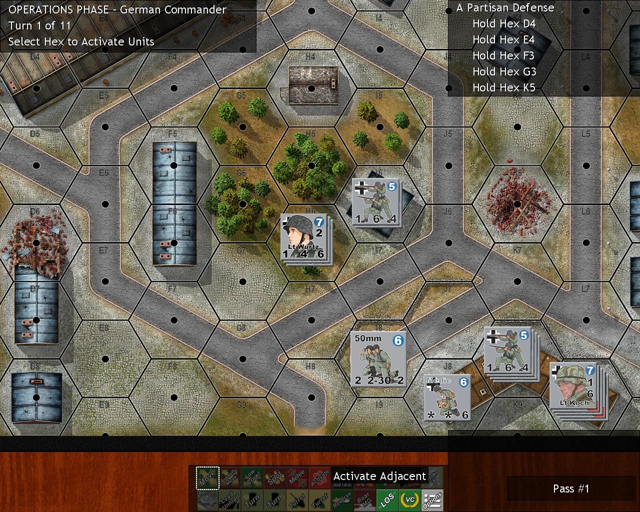 Amikor lépünk, megzavarhat az ellenség és megállíthat minket, de ha ezt nem teszi, akkor a lépés viszonylag egyszerű, hiszen annyit mozoghatunk, amennyi az egységünkön a leléphető szám. (Persze a különböző területtípusok különböző értékekkel csökkentik ezeket a számokat). Viszont a lövés elég bonyolult (egy társasjátékhoz képest): először is egyáltalán nem biztos, hogy látjuk az ellenséget. Ezt is kockadobással kell eldönteni, ami ha sikertelen, akkor bizony nem lőhetünk. Ha azonban sikeres, akkor láthatóvá válik (spotted) az ellenség, és végre tüzelhetünk. Ekkor kiszámolódik a tűzerő – ami persze a távolságtól is függ –, majd dobnunk kell kockával, hogy valójában a tűzerőnkből mennyi kárt tudunk okozni. Majd ezután az ellenség is dob, annak fényében, hogy milyen a pozíciója, illetve, hogy a hexe mennyire védi. Aztán a két dobás különbségéből kiderült, hogy teljesen hatástalan volt a tüzünk, vagy legalább betojattuk őket (shaken), esetleg megsebesültek vagy meghaltak.