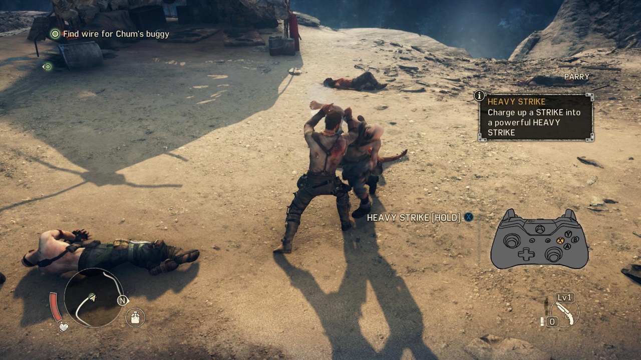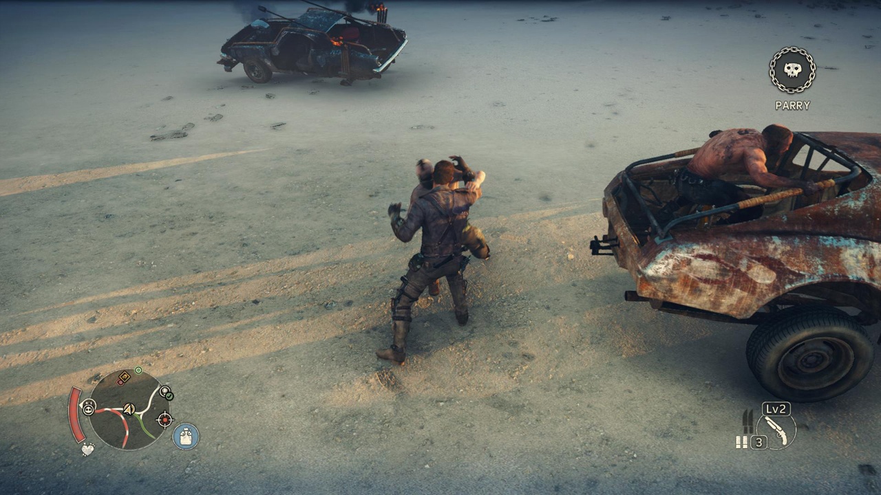 A Mad Max alapvetően tekinthető autós játéknak is, hiszen időnk nagy részét a volán mögött töltjük. Ehhez képest szerintem az autók irányítása egy picit elnagyolt lett, időbe telik hozzászokni. Cserébe a verekedés az első néhány mozdulat után már az ember kisujjában lesz – mivel mindössze két billentyű vad nyomogatásában ki is merül. Az egész rendszert a Batman: Arkham szériából emelték át: támadunk, támadunk és támadunk, majd mikor egy ikon jelzi, hogy valaki készül megütni, egyszerűen kivédjük azt és kontrázunk. Egész látványos bunyók kerekednek így, főleg, amikor a kézifegyverek is előkerülnek, de Max a tereptárgyakat is előszeretettel felhasználja. Mindezt pedig megspékelték a haraggal is, ami harc közben egyre növekszik bennünk. Ha elér egy szintet, Max sokkal erősebbé válik, és olyankor egy egész seregnyi War Boy-jal is könnyedén elbánik.