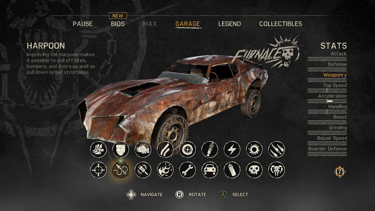 A tuti verdához persze kőkemény sofőr is kell, ezért Maxet sem hagyhatjuk eltunyulni. Ahogy az Opust, úgy őt is két szinten lehet fejleszteni. A játék bármely szakában alakíthatunk a fizimiskáján (új ruhát adva rá, ami növeli a védelmét, vagy egyszerűen megváltoztatva a szakállát, aminek totál semmi gyakorlati haszna – de a Mel Gibsonos A rettenthetetlenes kék arcfestés hatalmas poén), nagyobb tölténytárakat, erősebb fegyvert adhatunk neki, valamint új közelharci támadásokat taníthatunk neki. Ezek persze mind szintlépéshez vannak kötve, de az meg elég gyors folyamat. Emellett pedig van a pusztában egy titokzatos alak, aki látszólag rengeteget tud Max előéletéről. Nála az általános tulajdonságait erősíthetjük, mint az életerő vagy a fosztogatás hatékonysága.