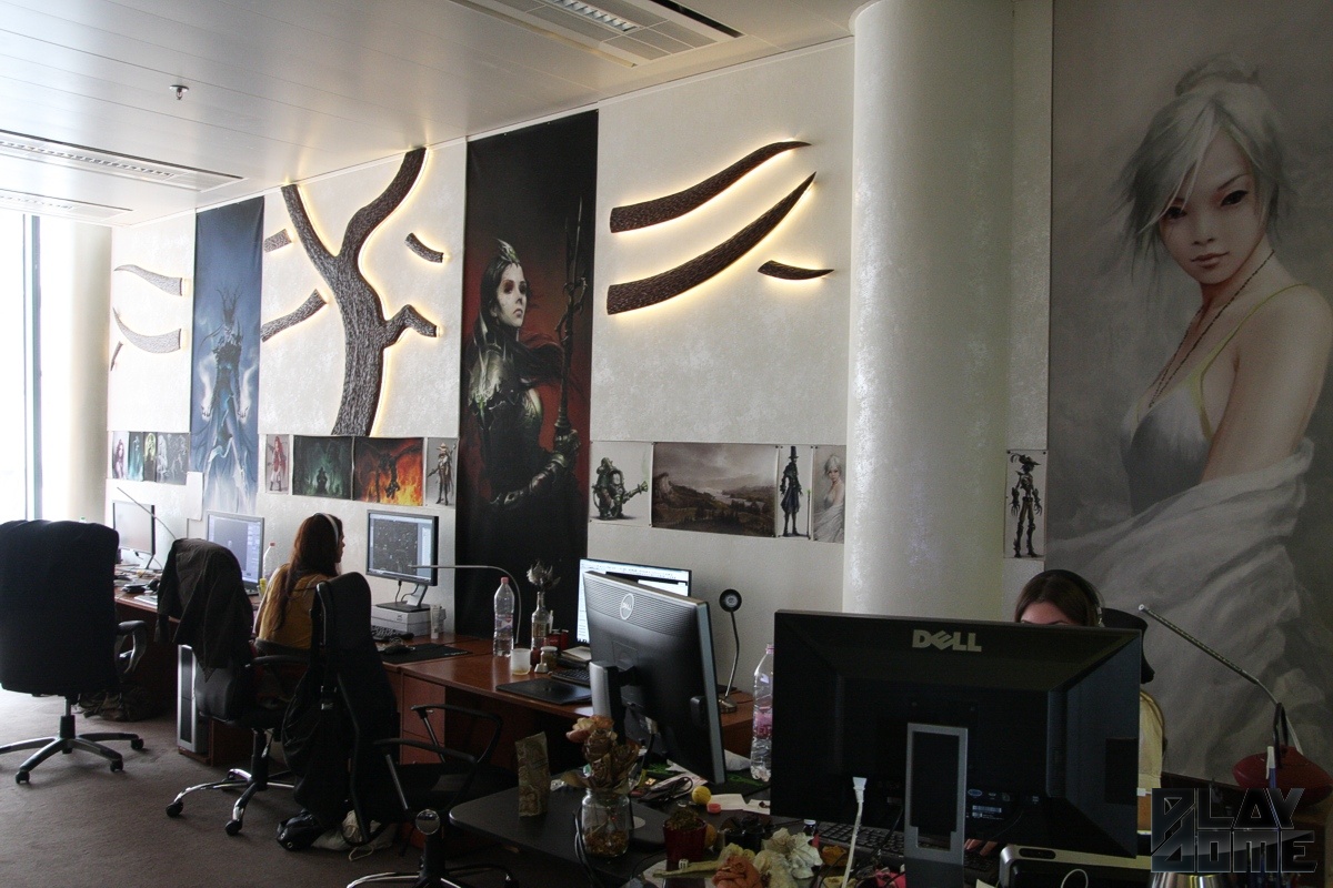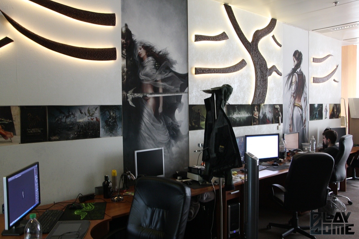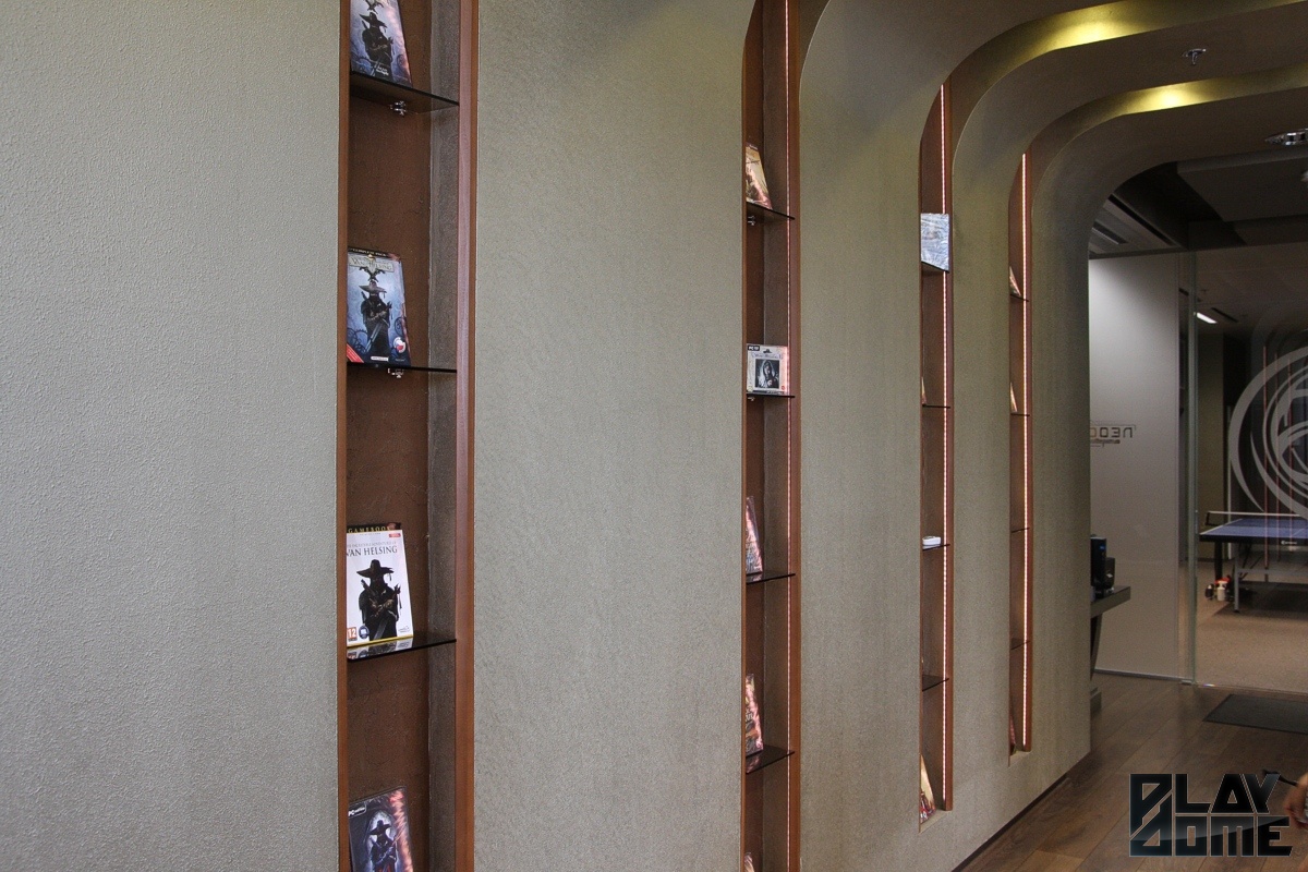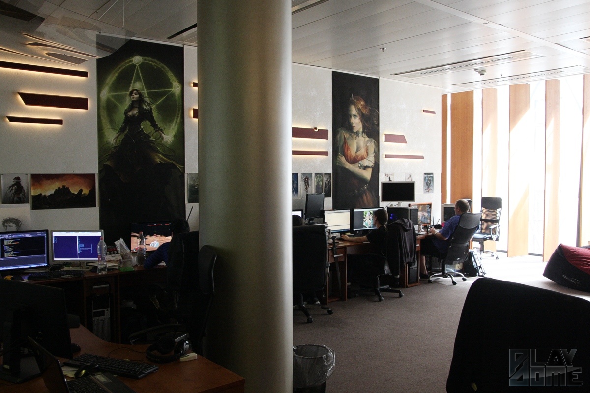 Utunk ezúttal Budapest belvárosába vezetett, mégpedig a Vörösmarty térre, ahol a tér egyik oldalát elfoglaló, üveggel burkolt óriási épületben rendezte be főhadiszállását a cég. Bejutásunk kicsit trükkös volt, mivel az irodaháznak három különböző bejárat is van, de végül csak sikerült odatalálnunk, és amikor a liftajtó kinyílt, a falon lévő óriási Neocore logo egyértelművé tette, hogy jó helyen járunk. Az előtérben lévő pingpongasztal mondjuk váratlan volt, de mivel a szint egyetlen lakója a NeocoreGames, így érthető, hogy ezt a teret is kihasználták rekreációs helyszínként. A modern irodában kisebb-nagyobb helyiségekben dolgoznak a munkatársak, a falakat jellemzően saját grafikái díszítik, a folyosón pedig játékaik dobozai sorakoznak. És persze az egyik szoba polcai nem véletlenül vannak tele Warhammer 40,000 figurákkal, hiszen jelenleg ebben az univerzumban készül a legújabb Neocore-játék.