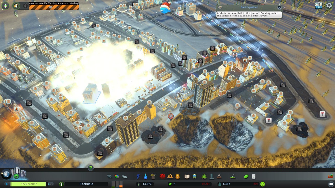 Nos, a legjobbaknak mindez mára már a kisujjában van, és a sok utólag érkezett bővítés ellenére a Cities: Skylines is idővel egy picit unalmassá válhatott. Ezen segíthet a legújabb DLC. A Natural Disasters, ahogy az a címéből is kitalálható, a természeti katasztrófákat hozta el virtuális városaink mit sem sejtő lakóinak életébe. Miután felépítettük, és éveken át gondosan egyengettük városunk életét, itt az ideje, hogy fenekestül felforgassuk azt. Ehhez pedig a legváltozatosabb módszereket kaptuk meg. Azt a fejlesztők már a tavalyi gamescomon is kihangsúlyozták, hogy TERMÉSZETI katasztrófákban gondolkoznak, vagyis sem Godzilla, sem a földönkívüliek nem fogják megszállni az utcákat. Helyettük kapunk viszont tornádót, ami keresztülsöpör a városon, hogy épületek romjait hagyja egy csíkban, ahol haladt. A földrengés ennél is pusztítóbb: méretes repedés szakítja ketté a talajt, és hatalmas pusztítást visz végbe az épületek közt. Hozzá hasonló a víznyelő, amely szinte a semmiből bukkan fel és feneketlen gödröt varázsol a kertváros kellős közepére. Sebaj, majd a tengerparton kiheverjük. Kivéve, ha elmos minket a cunami! És akkor még az olyan „apróságokról”, mint a tűzvész vagy az épületek véletlenszerű összeomlása, nem is beszéltem. Ha szerencsénk van, akkor csak egy méretes vihar csap le a városunkra, ha meg pechesek vagyunk, egy meteor pottyan le az égből.