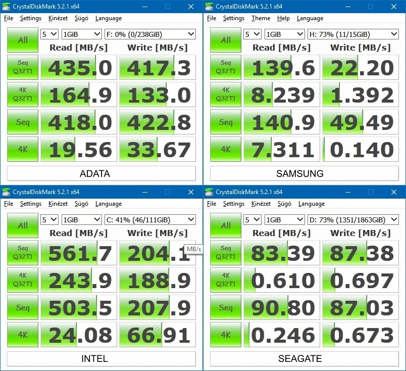 A teszteredmények a mellékelt képen láthatóak. A gyárilag megadott értékekhez meglepően közelieket kaptam, méghozzá úgy, hogy az alaplapom csak 3.0-s USB szabványt tud, míg az SD600 valójában 3.1-es. Az általam rendszermeghajtónak használt Intel 540-hez képest nem is áll rosszul – sőt, írási sebességben bőven le is pipálja. A vicc kedvéért a játékokat tartalmazó, 2 TB-os Seagate Barracuda Green merevlemezemet is megmértem: érthetően kanyarban sincs az SSD-k tempójához képest. Van itthon egy egyszerű, 16 GB-os Samsung USB 3.0 pendrive is, összehasonlításul azt is teszteltem gyorsan – az eredményen kicsit meglepődtem, azt azért tempósabbnak hittem.
