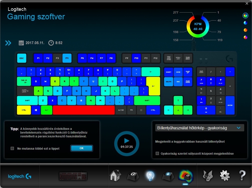 A G413 szoftverében számos lehetőség nyílik meg a billentyűzet testre szabására: beállíthatjuk a háttérvilágítás fényerejét és hogy pulzáljanak-e a LED-ek (ennek sebessége is módosítható), letilthatunk egyes gombokat (például a sokaknak bosszantó pillanatokat okozó Windows billentyűt), és külön profilokat hozhatunk létre az egyes játékokhoz, akár makrókat is definiálva a gombokra. Végül pedig egy érdekes hőtérképet is megjeleníthetünk, amely azt mutatja, hogy mely billentyűket használtuk a leggyakrabban. Ennek igazából gyakorlati haszna nincs, de mókás érdekesség. Külön médiakezelő gombokat nem raktak erre a klaviatúrára, helyette az F-gombok kaptak másodlagos funkciót, mint például hangerőszabályzás, lejátszás/leállítás vagy számléptetés.