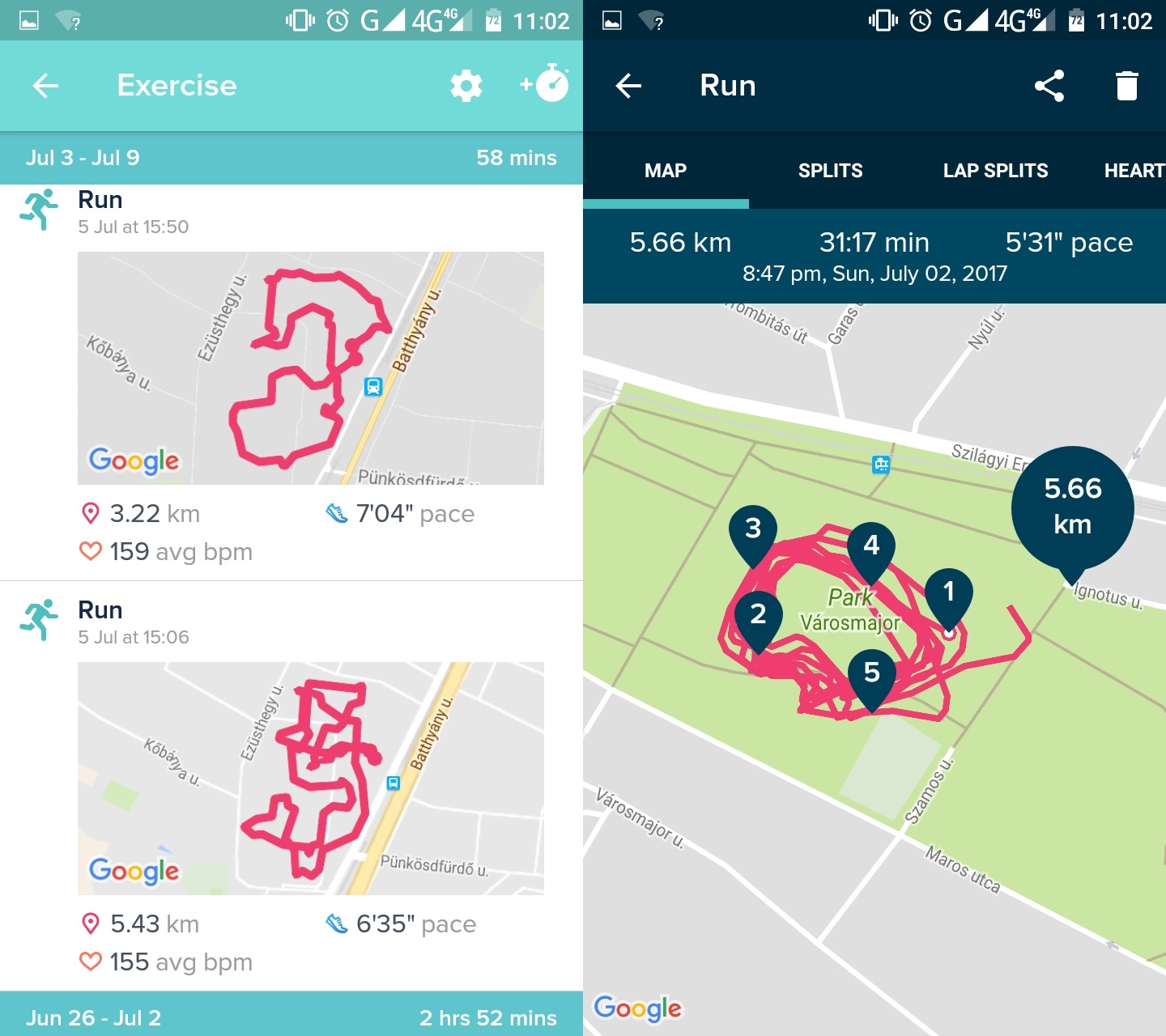 A konfigurálás mellett az alkalmazás fő funkciója természetesen teljesítményünk kijelzése, mindenféle statisztikák megjelenítése. Ezeket ráadásul a Fitbit weboldalán létrehozott fiókunkhoz is szinkronizálhatjuk, ahonnan akár más ilyen online szolgáltatáshoz is továbbíthatjuk – igaz, valamiért a futások adatai nekem nem mentek át automatikusan Endomondóra, azt TCX-be exportálva tudtam áttölteni az általam használt weboldalra. Kiírja a program, hogy mennyit mért a nap során a lépésszámláló, vagy ha futáshoz használtuk, mekkora távot tettünk meg, mennyi idő alatt – és még a pulzusunkat is folyamatosan követi grafikonon. És mivel a Fitbit Surge-ben még GPS is van, útvonalunkat is visszanézhetjük a térképen. Tökéletes pontosságra mondjuk nem számíthatunk, kb. a telefonom GPS-éhez hasonló eredményt kaptam, a városmajori futópályán körözve szinte nem volt két azonos vonalúnak jelzett kör. Talán emiatt volt hiába beállítva az is, hogy köröket futok, nem érzékelte, mikor van vége egy-egy körnek. Futás közben amúgy megtett kilométerenként kicsit rezgett karomon az óra, és olyankor röviden pár paramétert (például tempó) olvashattam le a kijelzőről.