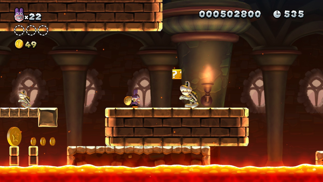 Azok se csüggedjenek, akiket a program helyenként idegtépő nehézsége alapból elrettentene a játéktól, mert a fejlesztők bizony rájuk – így a legkisebbekre és a legkevésbé gyakorlottakra – is gondoltak. Egyfelől, ha jó néhányszor elhalálozunk egy szinten, akkor Luigi megcsinálja azt helyettünk, ha akarjuk – igaz, szinte semmit nem szed össze közben. Másfelől a választható szereplők közül Toadette a könnyű, míg Nabbit a nagyon könnyű módot is jelenti. Az utóbbi figura arra is alkalmas, hogy vihargyorsan – tényleg mindössze néhány óra alatt – elérhetővé tegyük vele az összes pályát, amelyekre azután kedvünkre visszamehetünk immár azzal, akivel csak akarunk. Nabbitnak nem árt semmilyen ellenfél, cserébe azonban nem hatnak rá a többieket extra képességekkel felvértező boosterek sem. Toadette – Toad kislány párja – a többieknél kevésbé csúszós talpú, így vele könnyebb az időzítés és a precíz ugrás, valamint társaihoz képest több lootot talál, ami a kimaxolásra hajtóknak jelenthet előnyt. Szintén ő képes az újdonságként bekerült „szuper korona” felhasználásával Peachette-é változni, akinek a többiektől ugyancsak eltérő tulajdonságai vannak, így például jobban megy neki a levegőben siklás bárkinél. A többiek – Mario, Luigi és Toad – is kicsit más-más taktikát igényelnek, ami egyszersmind a New Super Luigi U létjogosultságát is megalapozta. Ebben a játékban Mario nincs jelen, így a tesóra hárul a hős szerepe, aki azonban langalétább az öcsinél, így másképp ugrik, és másképp is lépked. Mindezek jóvoltából ez az epizód az alapjáték megfelelően módosított pályáit tartalmazza, amelyeken gyorsan kell végigsprintelnünk, tekintve, hogy az időlimit száz másodperc, nem pedig ennek megszokott többszöröse. A sima játék mellett három másikban is kipróbálhatjuk magunkat – ezek a Challenge, a Boost Rush és a Coin Battle –, ami megtöbbszörözi az amúgy is kiadós program szavatosságát.