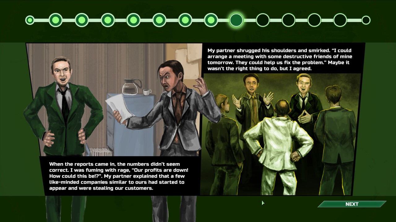 A szoftver már első látásra is kifejezetten bonyolultnak tűnik, és a kezelőfelület sem mondható egyszerűnek. Az autodidakta tanulást véleményem szerint mellőzzük, helyette inkább nyomjunk rá a sztori módra, hiszen az apa-fia szállítmányozási cég felépítése egyben egy remek tutorial is. A mesélés nincs túlbonyolítva, pont annyi, amennyi kell. Képregényes stílusban a pályák között bontakozik ki a családi kisvállalkozásból lett gigavállalat, ami a végére már nem csak egyszerű buszos és kamionos fuvarozással foglalatoskodik. Apró fordulatok, kis illegális tevékenység, más cégek keresztbehúzása és a sztrájkolás negatívumai is bemutatásra kerülnek. A sztori végére pedig nem kicsit fog benehezedni a játék, ez pedig extra szórakozást ígér, miközben szépen fokozatosan tanuljuk meg, mire jó, ha luxus elsőosztályú buszokat veszünk vagy vontokkal, esetleg repülővel oldjuk meg a nagyobb rakományok A pontból B pontba való mozgatását.