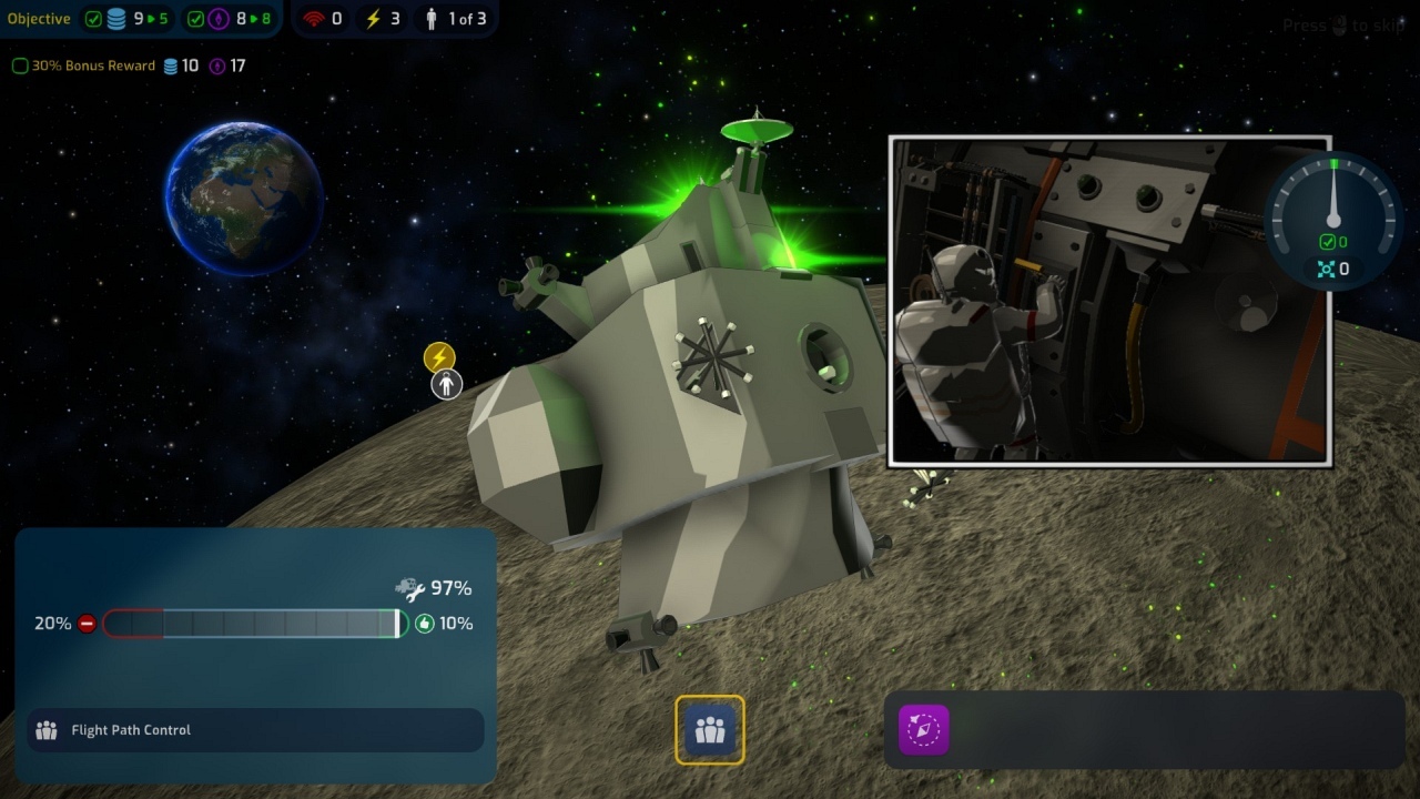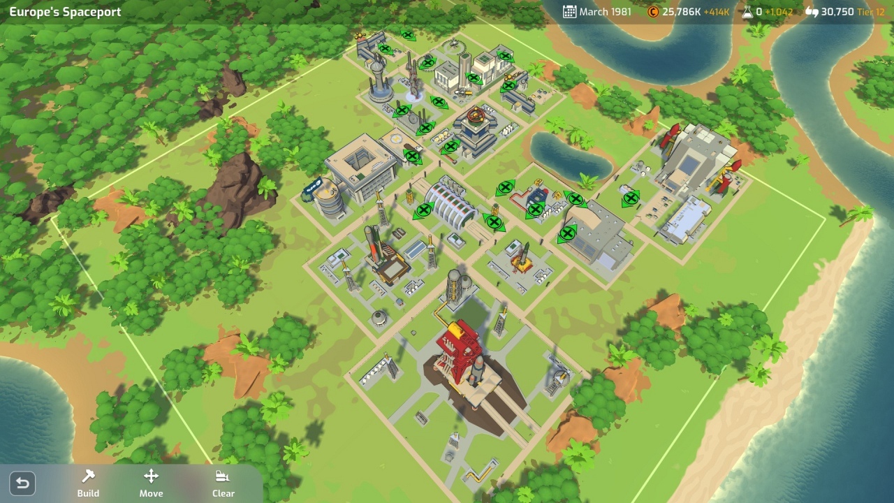 Szintén minijáték űrközpontunk építgetése is. Ezt a tavaly nyári alfa változatban nagyon utáltam, de szerencsére azóta könnyítettek rajta. Tehát egy szűk területen kell elhelyeznünk épületeinket, de úgy, hogy nem csak az épületnek van ára, hanem ha dimbes-dombos tesszük, ott a földmunkáknak is elég súlyos költsége van. Ráadásul az sem mindegy, melyik épület mellé tesszük az újat, mert egymásra is hatással vannak (negatív és pozitív értelemben is). Persze nem lehet megúszni az építést, mivel vannak kötelező épületek (például nagyobb kilövőhely a messzibb küldetésekhez) és erősen ajánlottak (pl. az, amelyiknek köszönhetően több küldetésünk is futhat párhuzamosan), de akad nem kötelező is, mint a plusz laboratóriumok, amelyek plusz tudománypontokat adnak. Vagy azok az épületek, amelyek csökkentik a küldetések során fellépő negatív események valószínűségét.