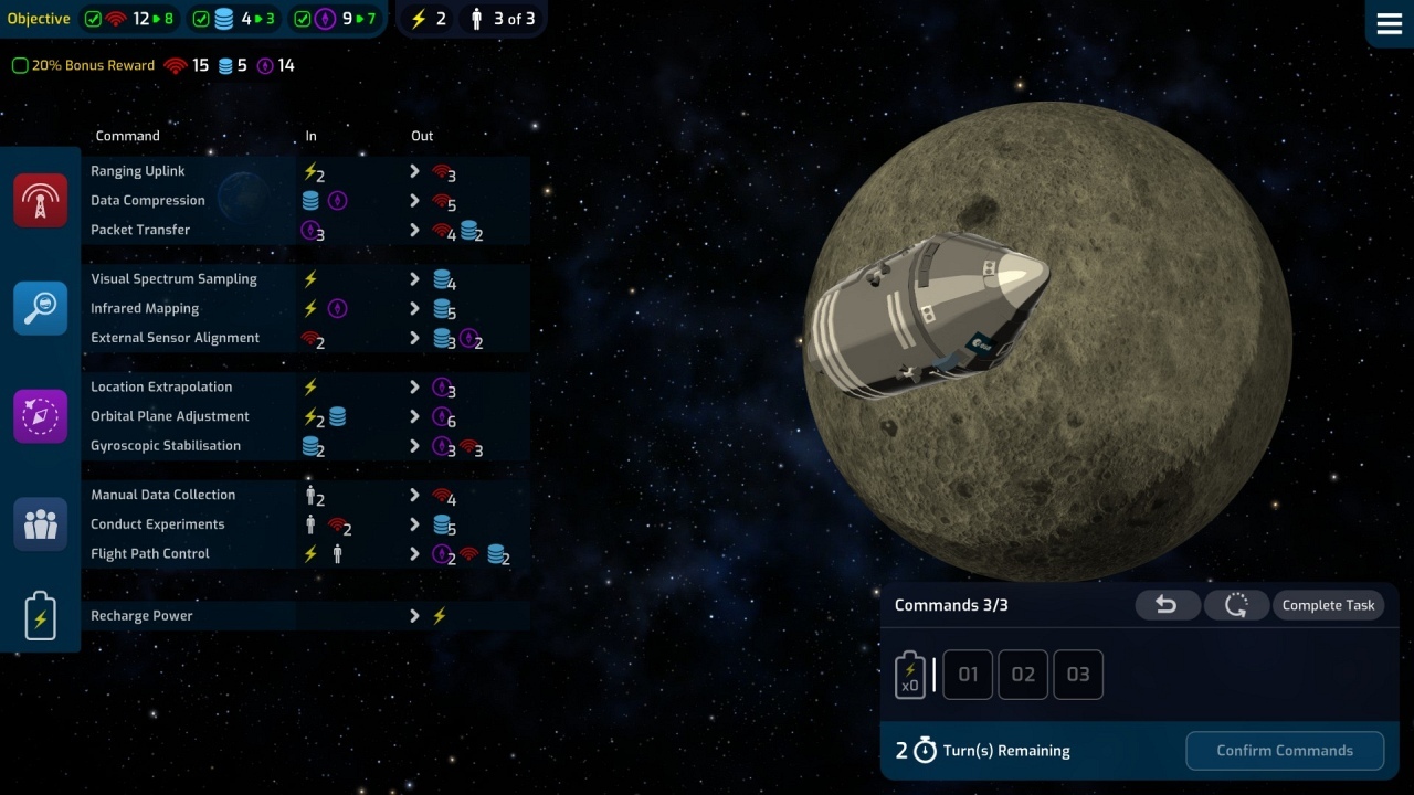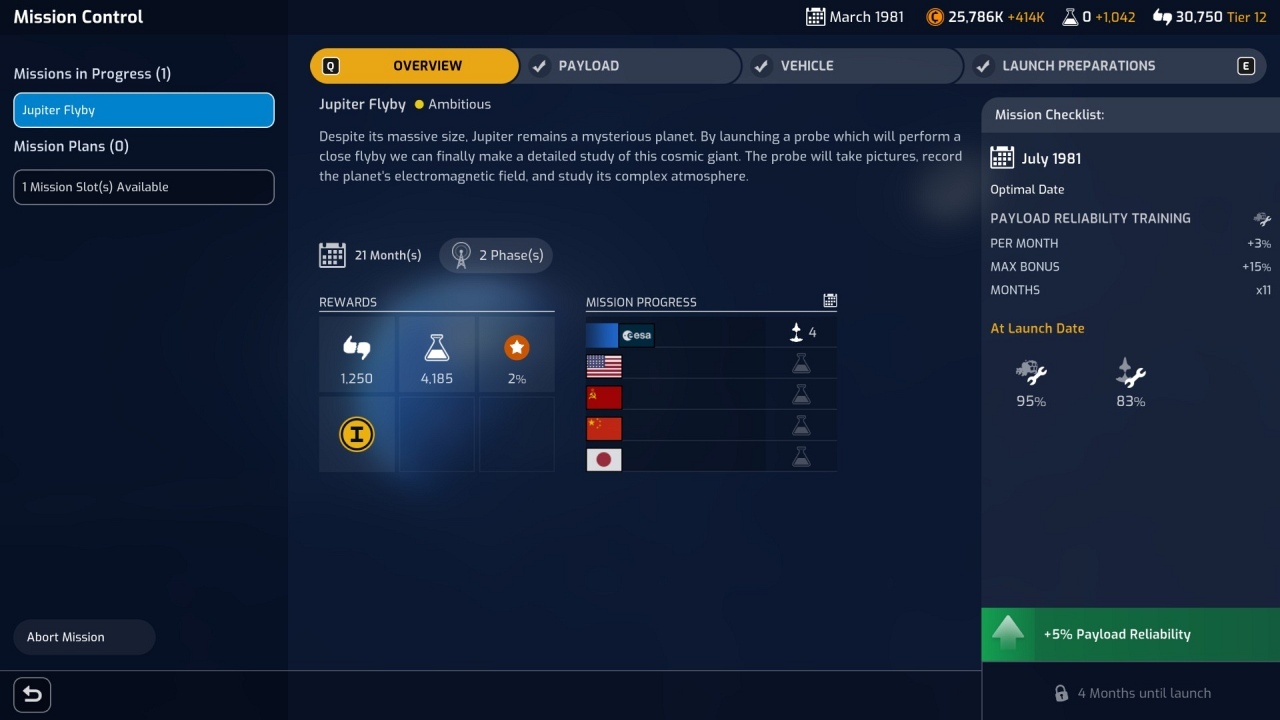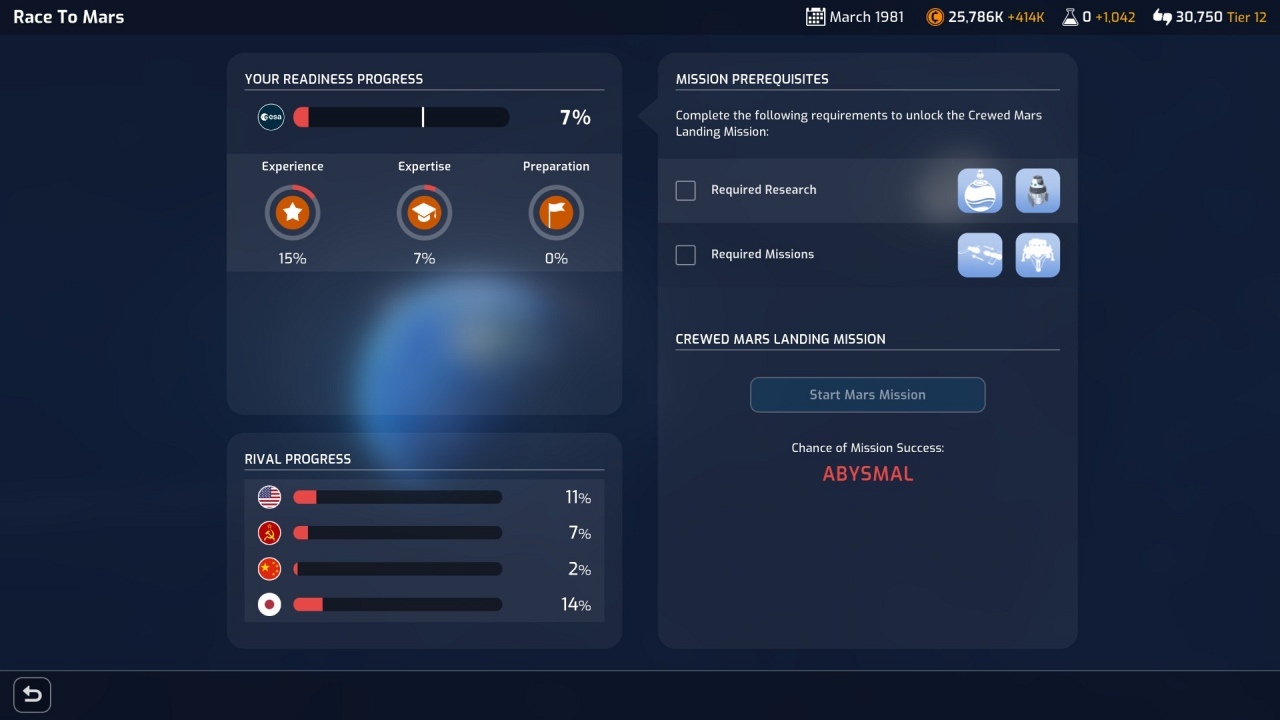 Cserébe viszont a Mars Horizon egy hosszú játék. Nincs az az érzésünk, hogy hiába dolgoztunk keményen egy szuper ügynökség összehozásán, hiszen az Apollo program után leállítanak minket. Itt folytatódik a kutatás, sőt, ha nem akarunk összefogni, akkor a verseny is. Az is nagyon jó, hogy nem kell – sőt, ha a verseny a fontos, akkor nem is lehet – mindent megcsinálni. Haladni kell a tudományfának a küldetésekről szóló részében, és a szerintünk fontos küldetésekre koncentrálhatunk. A konkurens űrügynökségek már normál nehézségi fokozaton is meg fognak izzasztani minket, így lesznek olyan küldetések, amelyeket talán érdemes kihagyni (ezzel azonban bukjuk a belőlük megszerezhető erőforrásokat). Szóval akad döntési helyzet rengeteg, amik ennek a játéknak a lényegét jelentik, a minijátékok mellett.