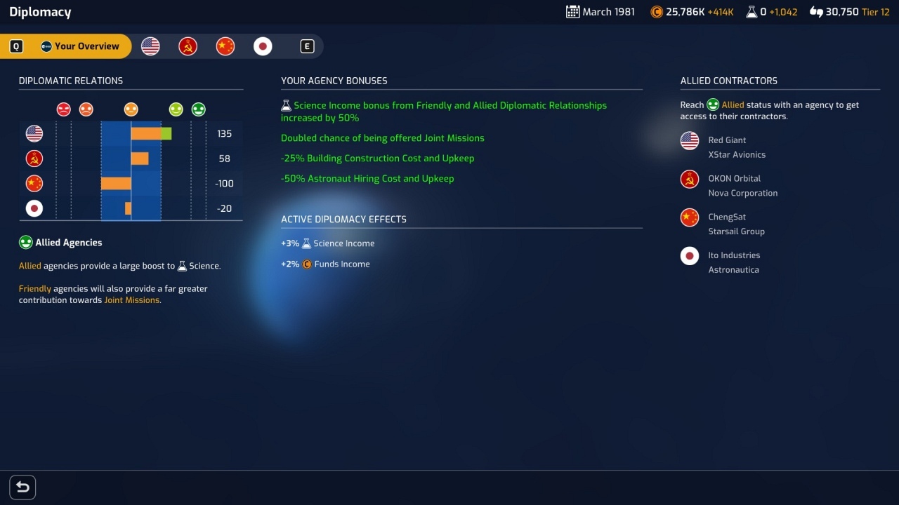 A Mars Horizonban – mivel nem csak a Holdra szállásig tart – kicsit történelmietlenül a következő űrügynökségekkel lehetünk: NASA, szovjet/orosz, ESA (Európai Űrügynökség), kinai és japán. Így akár – az akkor még nem is létező – ESA-val is Holdra szállhatunk 1969-ben. Az űrügynökségek főleg konkurenciát jelentenek a játékban: például ha csak harmadikként küldünk embert az űrbe, jóval kevesebb pontot kapunk érte (nem is beszélve a negyedik és ötödik helyről). Azonban lehetnek szövetségeseink is, ami egy nagyszerű újítás a hasonló játékokhoz képest. A megfelelő épület birtokában indíthatunk közös küldetést is a szövetséges űrügynökségünkkel, csak ehhez előbb jó kapcsolatot kell kialakítani velük az időközben kapott véletlen eseményekre hozott döntéseinkkel. Ilyenkor felezzük a küldetés költségeit, és persze az eredményeit is.