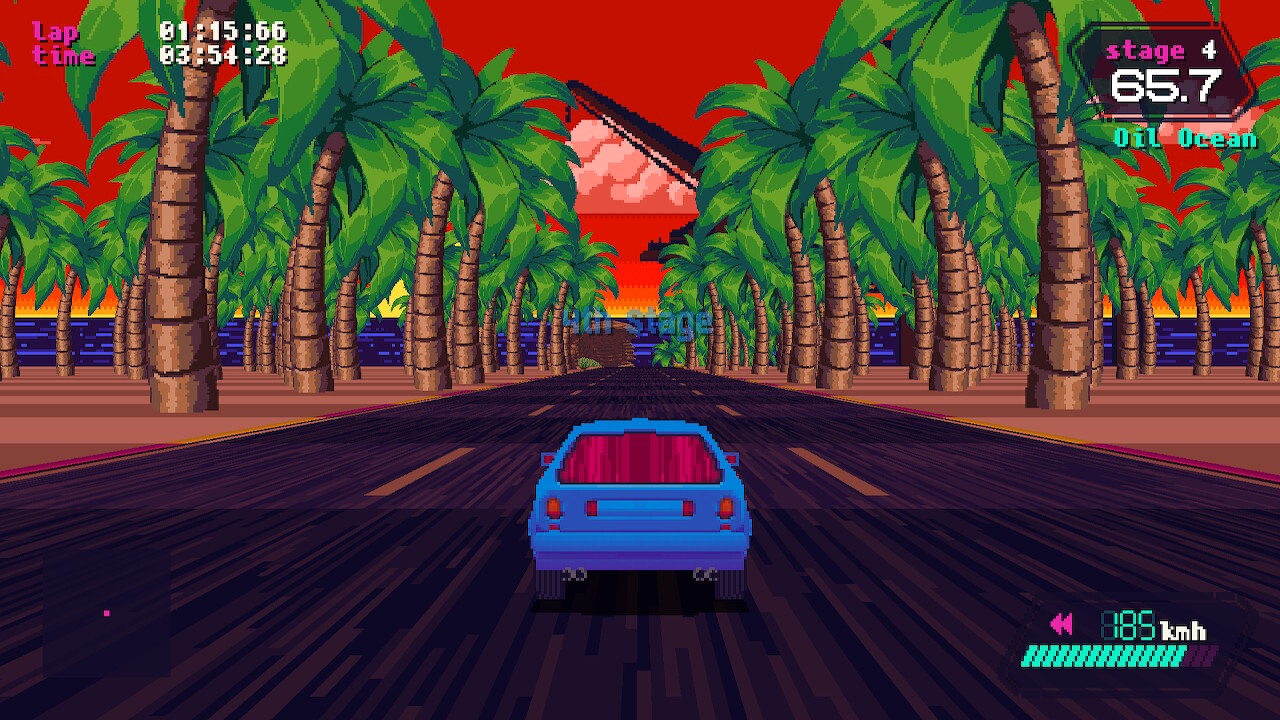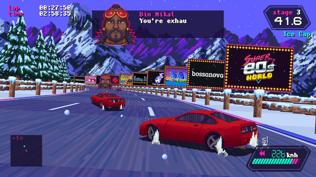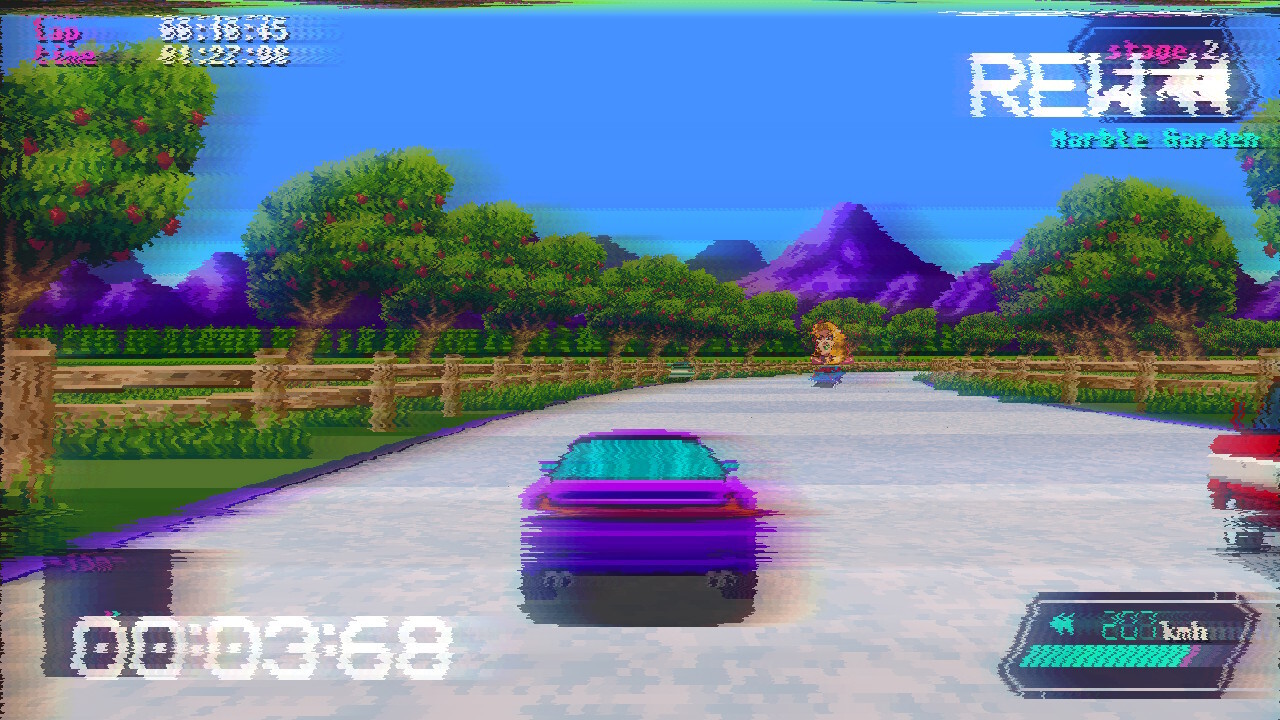 A játékmenet hűen idézi a kort: többféle módon mehetünk az ellenfelek és az óra ellen, és a nehézséget nem igazán a mesterséges intelligencia jelenti, hanem a forgalommal és a pályavonallal való küzdelem. Még a legkönnyebb szinten is izzasztó tud lenni a cucc, nem is kicsit – pedig annyi modernizálást kapunk, hogy vissza tudjuk pörgetni az utolsó pár másodpercet, remek VHS-effekt kíséretében (látom, felcsillant a szemed erre a három betűre, tehát tudod, mit takar – gyere, ülj előre!). Az autóválaszték 5 darabból áll, ami nagyon soványnak tűnhet, cserébe érezhetően más karakterisztikával bírnak.