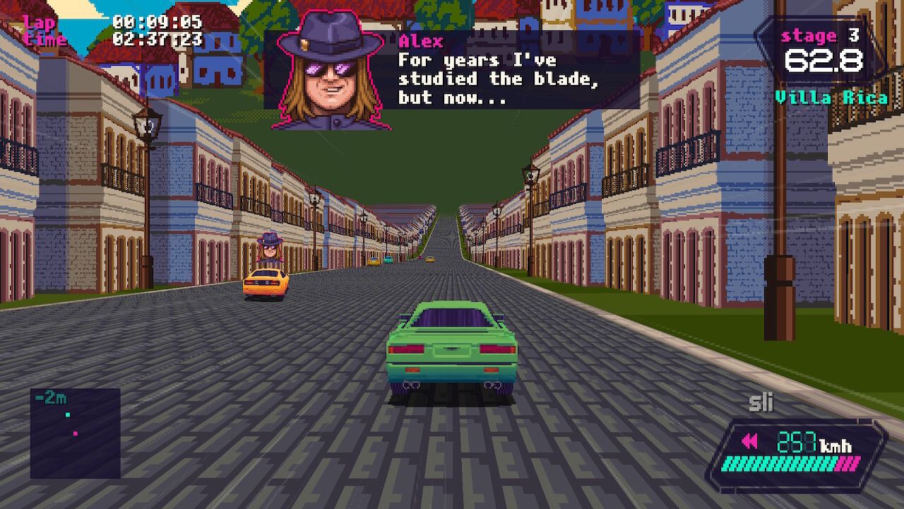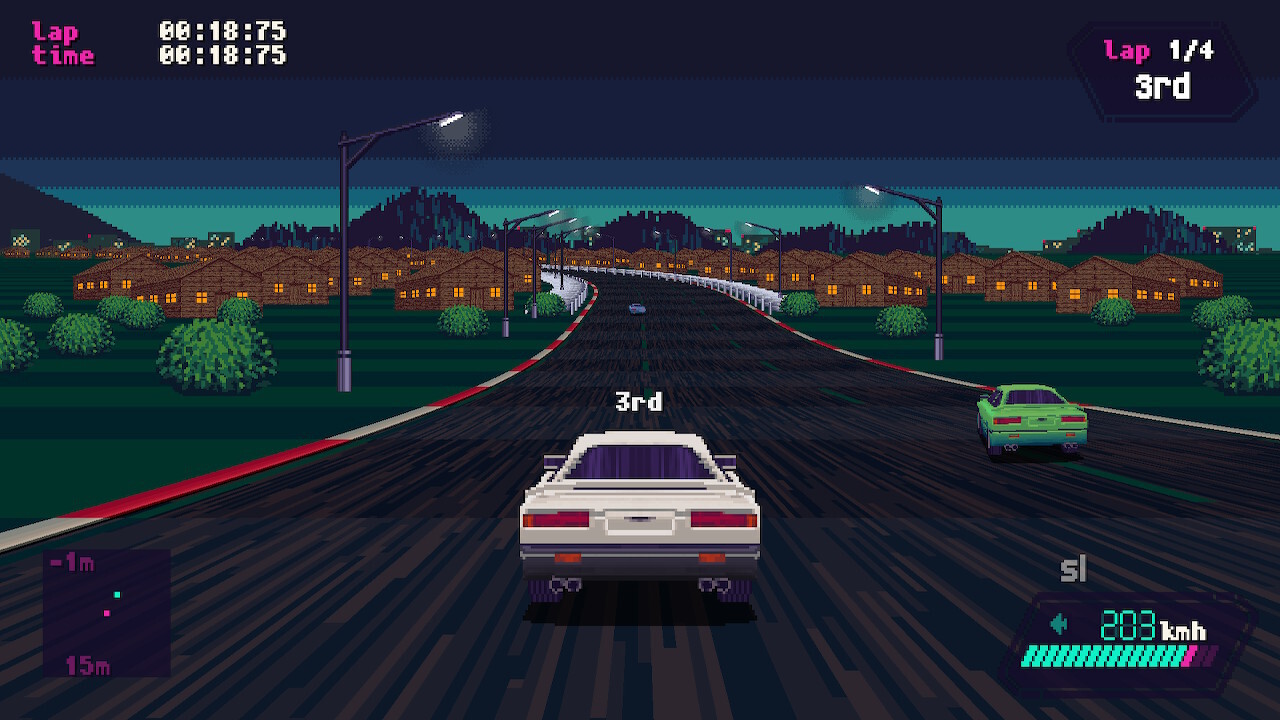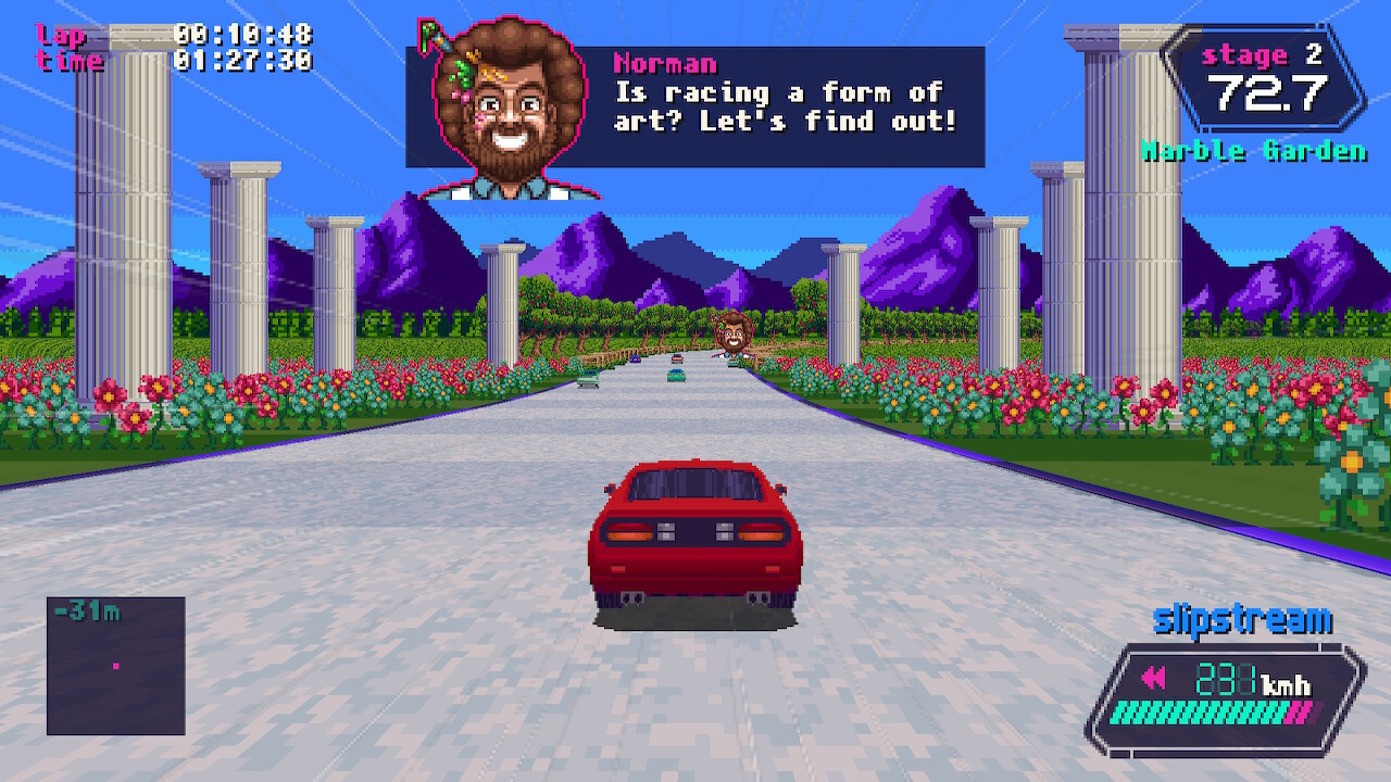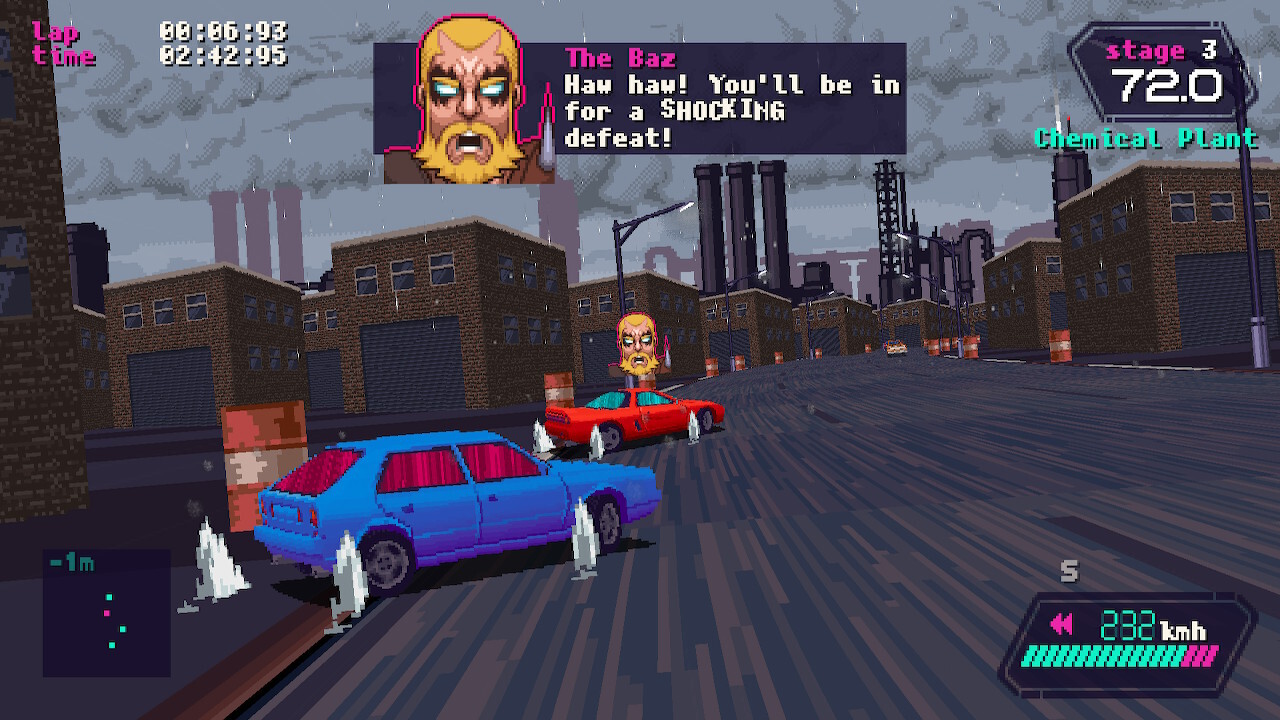 A játékmenet hűen idézi a kort: többféle módon mehetünk az ellenfelek és az óra ellen, és a nehézséget nem igazán a mesterséges intelligencia jelenti, hanem a forgalommal és a pályavonallal való küzdelem. Még a legkönnyebb szinten is izzasztó tud lenni a cucc, nem is kicsit – pedig annyi modernizálást kapunk, hogy vissza tudjuk pörgetni az utolsó pár másodpercet, remek VHS-effekt kíséretében (látom, felcsillant a szemed erre a három betűre, tehát tudod, mit takar – gyere, ülj előre!). Az autóválaszték 5 darabból áll, ami nagyon soványnak tűnhet, cserébe érezhetően más karakterisztikával bírnak.