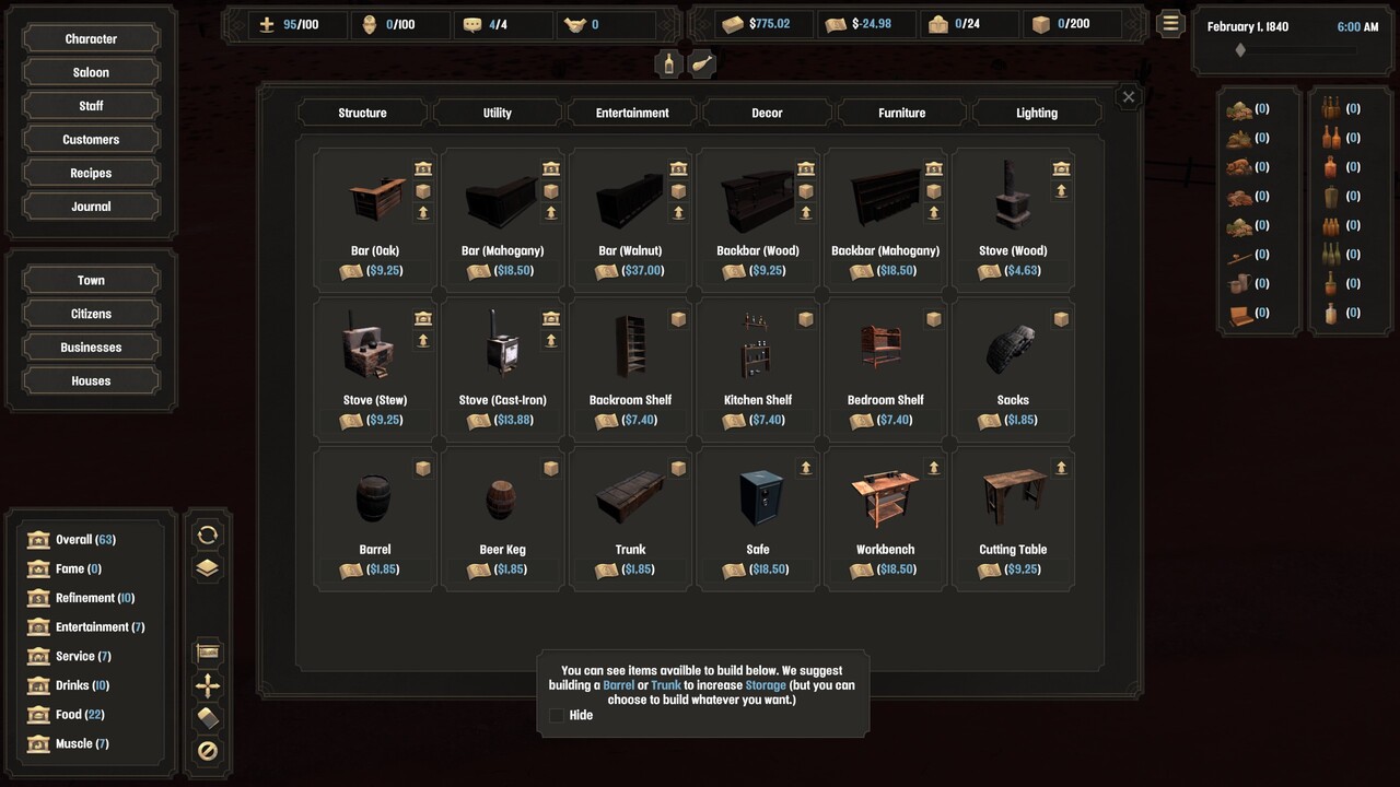 A sztori szerint egy éppen most alakuló településen tesszük próbára szerencsénket, és valóban, a játéktérre belépve a kocsmánkon kívül csak egy darab épület található kezdetben közel s távol. Ezen a ponton kapunk egy minimális tutorialt, de kielégítőnek nem nevezném. Első dolgunk kocsmánk berendezése lesz. Az épület négyzet alakú és kétszintes, ezen változtatni nem lehet, viszont a belteret úgy alakíthatjuk ki, ahogy szeretnénk. Ennek erősen Simses beütése van: falakat húzhatunk, bútort, dekorációt, világítást helyezhetünk el. Minél flancosabb a hely, annál vonzóbb lesz az emberek számára. Természetesen szükség lesz bárpultra, asztalokra, székekre, raktárra és konyhára is, ha azt szeretnénk, hogy mielőbb jöjjenek a vendégek. A kezdőtőkéből a földszintet elég jól be lehet rendezni, a későbbiekben az emeletre meg kerülhetnek a privát szobák az örömlányokkal.
