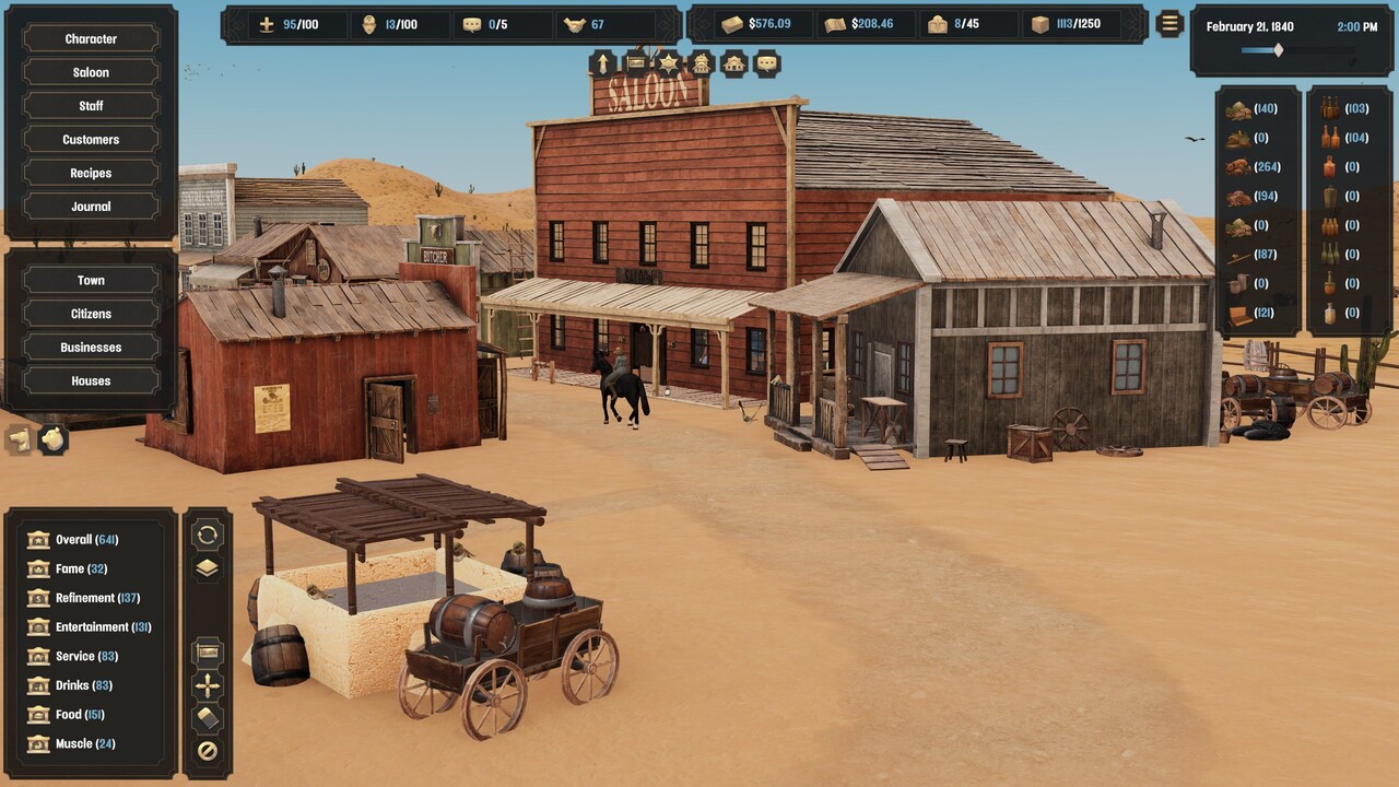 A konyhát elsőre nem értettem, aztán kiderült, hogy kocsmánk gyakorlatilag egyben étterem is, és elég változatos menüre fogunk szert tenni játék közben. Mind az italokhoz, mind az ételekhez szükség van alapanyagra, ezeket a település egyéb épületeiből tudjuk beszerezni. Lesz idővel hentes, vegyesbolt, szeszfőzde stb. A játékban található egy fejlesztési fa, ezen tudjuk kioldani a jobbnál jobb italokat és ételeket.