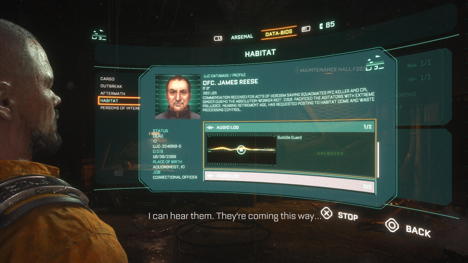 Az említett vascsövet szerencsére hamar lecserélhetjük egy, az őröknél található testápolóra. Ez és a későbbi fegyvereink is több pontban fejleszthetők lesznek, amiket stílusosan 3D-s nyomtatóval pimpelhetünk. Ötféle lőfegyver lehet nálunk, amiből csak kettőt kapunk ingyen, a többi tervrajzát magunknak kell megtalálni. És azután még valutából le is kell gyártani ezeket, tehát nincs ingyen. Minden fegyóhoz külön töltény dukál, ami a stuff első felében agyzsibbasztó frusztrációhoz vezethet a csupán hat zsebet számoló eszköztárunk miatt, ami sokáig nem fog bővülni. Lényegében a játék első fele a túlélősebb, a második már akciódúsabb. Később is lehet persze lopakodni és nyakon szúrni a bökővel a gyanútlan egyedeket, de lesz annyi lőszerünk, hogy egy sereggel is elbánjunk.