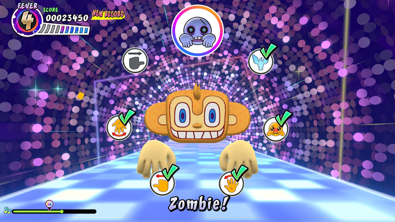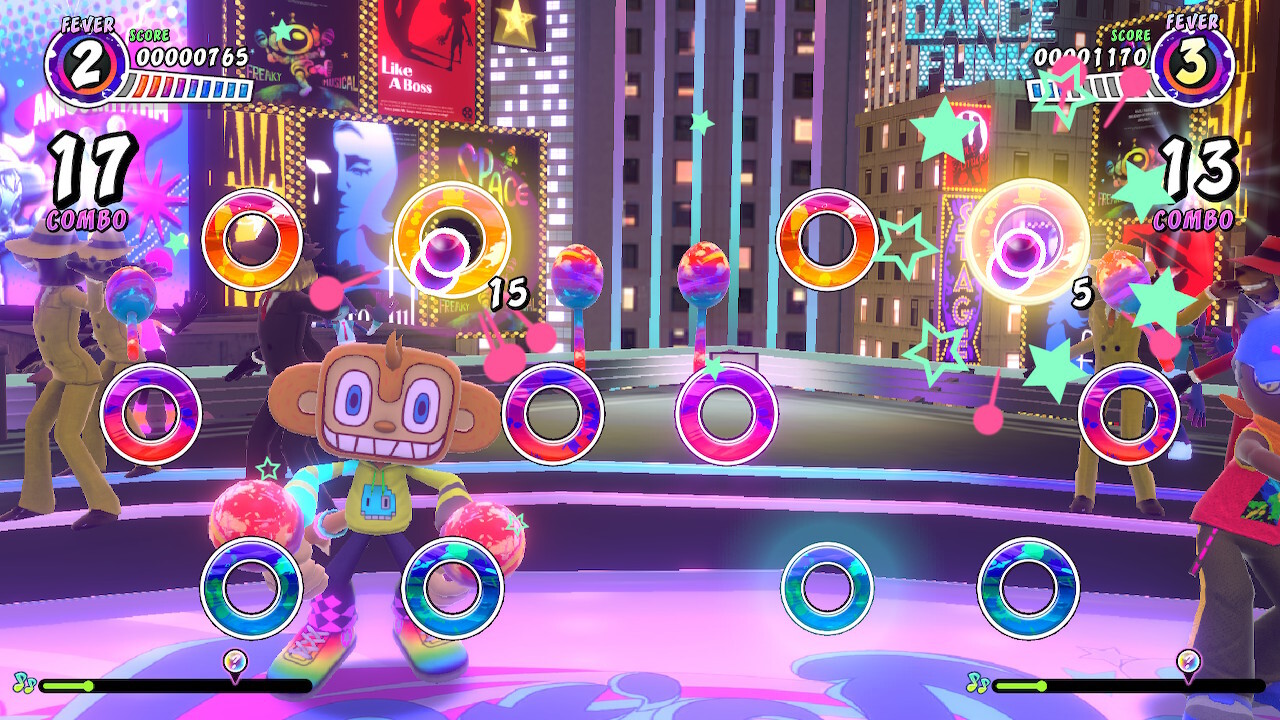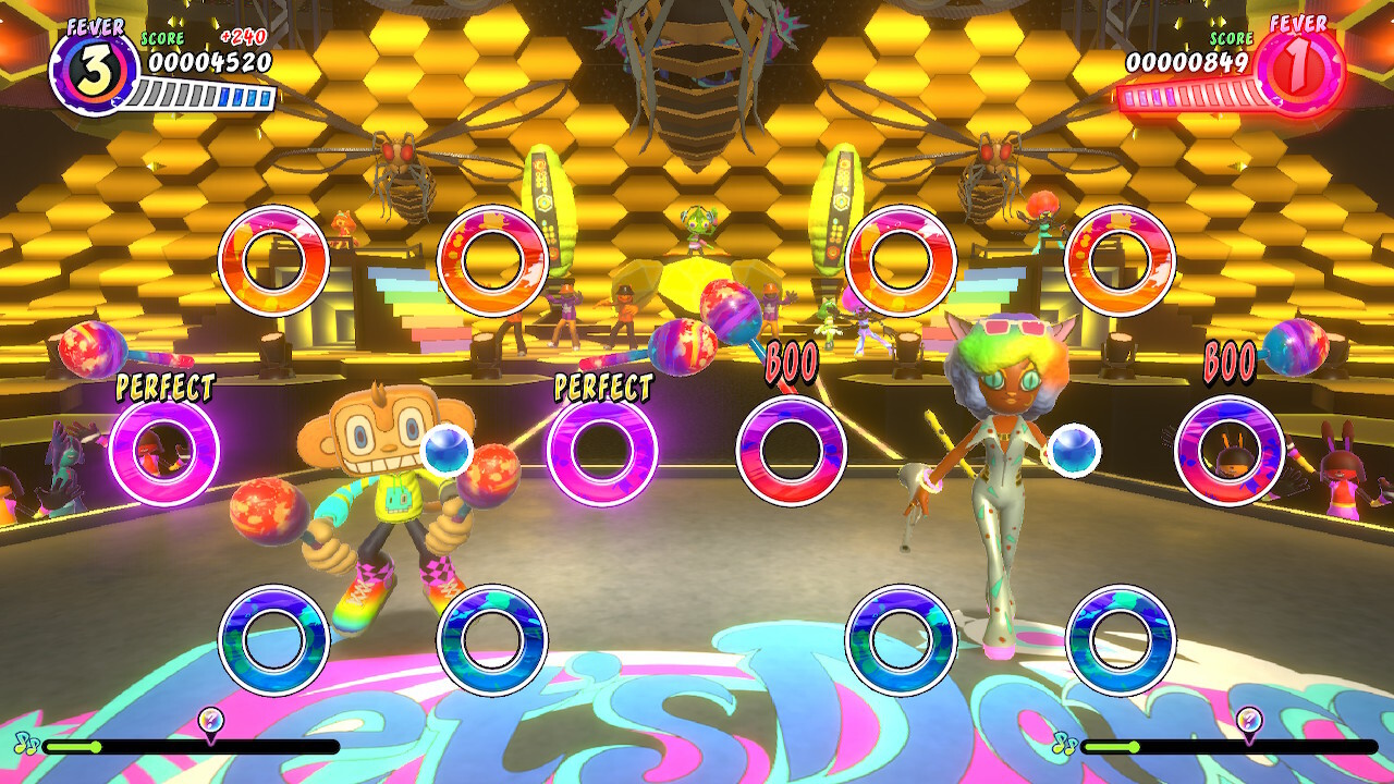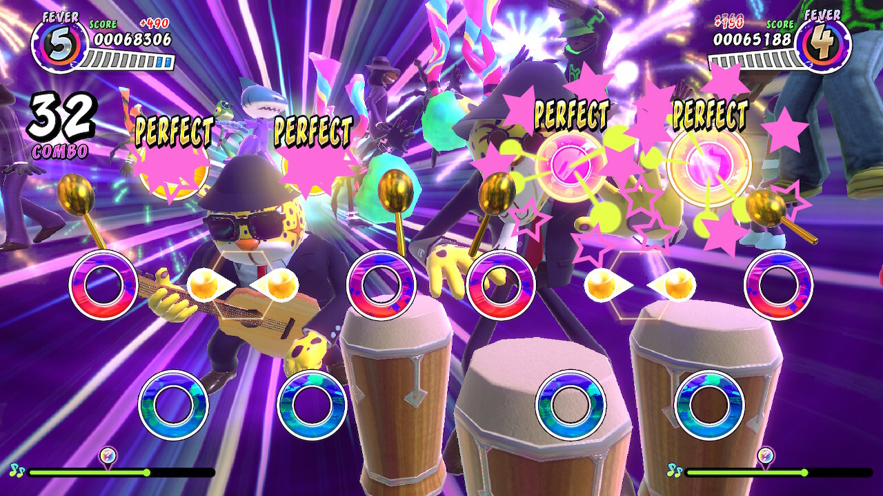 Maga a játék egyébként nem bonyolult és messze nem forradalmi. Adott egy naaagy adag zene, főleg a latinosabb fajtából (mégiscsak két maracát rázogatunk), aminek ritmusára egyedül, ketten, vagy online akár nyolcan is táncolhatunk. A körítés az, ami kicsit változik az egyes módok között. Van például sztorimód is, ahol Amigóval, a kockafejű majmunkkal a ritmust kell visszahozni a világba, de az alap módban minden dal elérhető, és bármilyen nehézségi szinten neki lehet futni. Teljesítményünktől függően kapunk némi játékpénzt, amivel Amigót és rumbatökeit tudjuk személyre szabni.