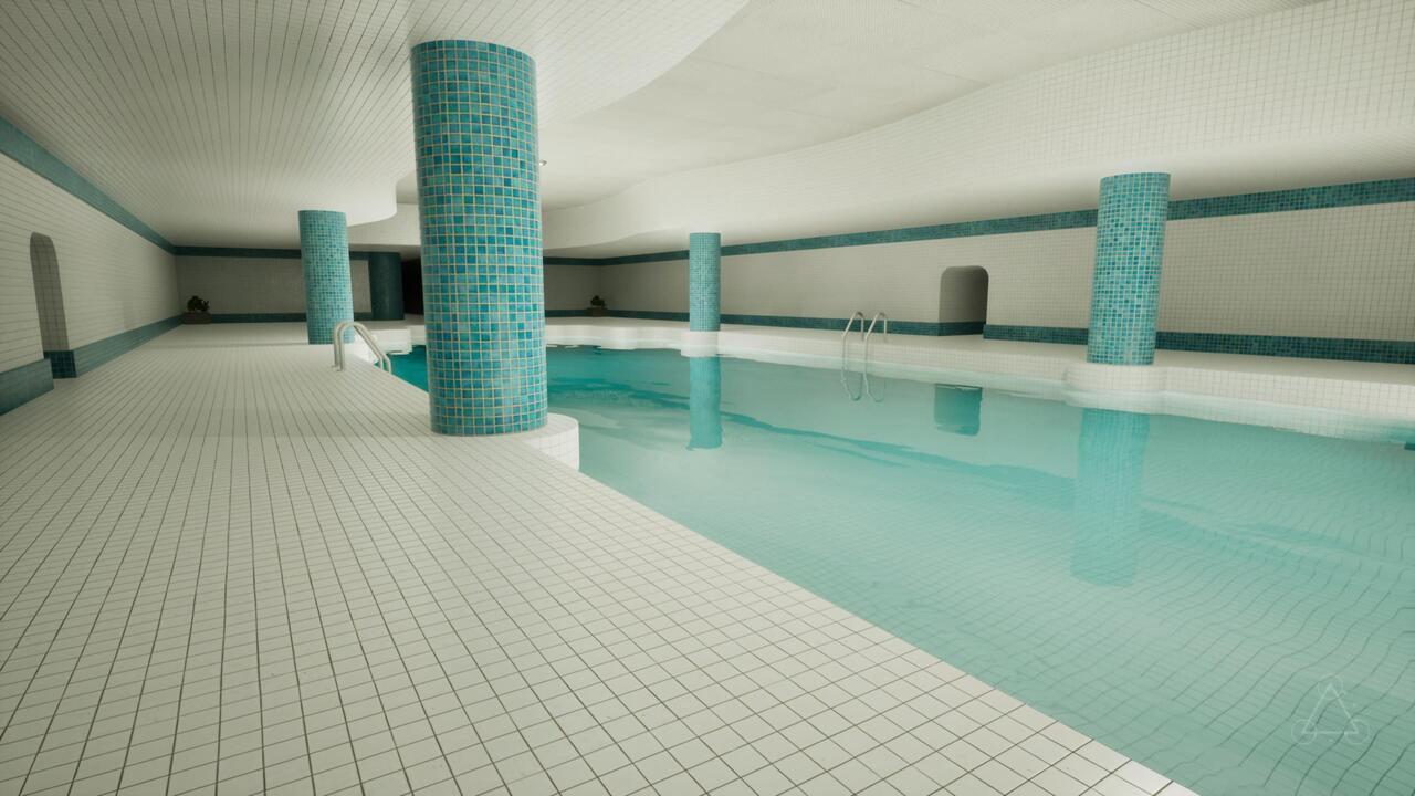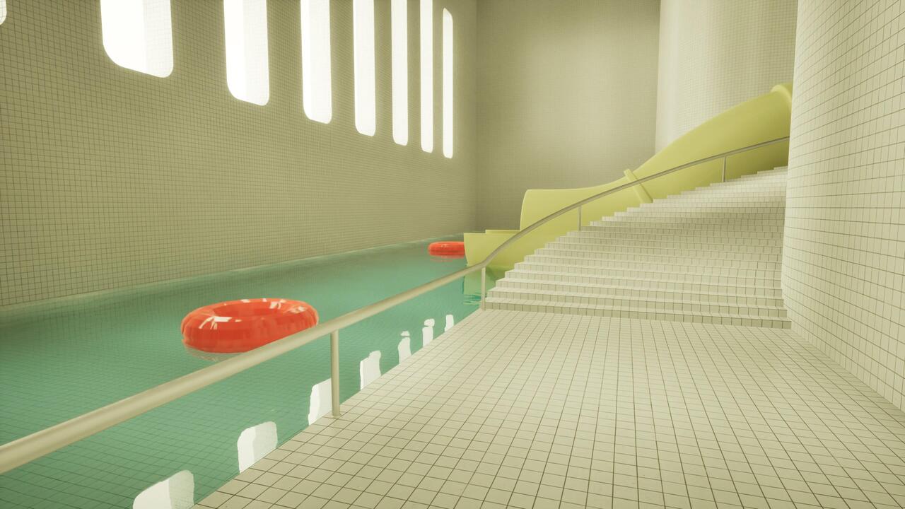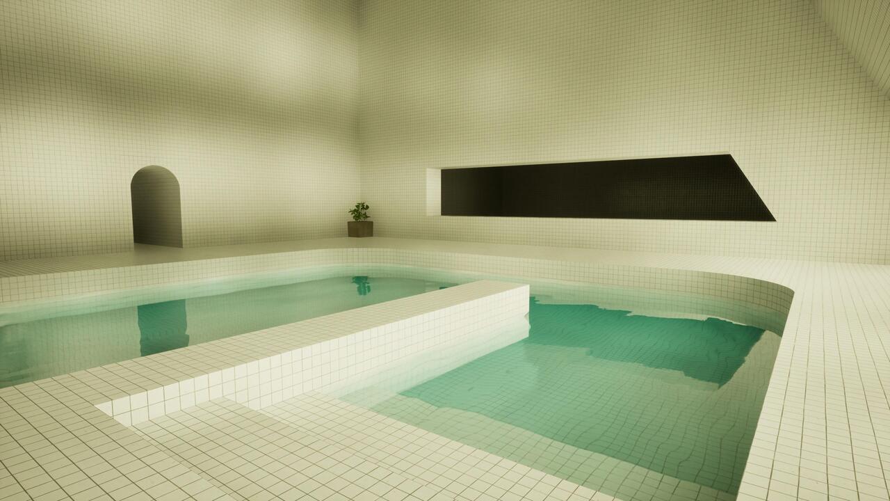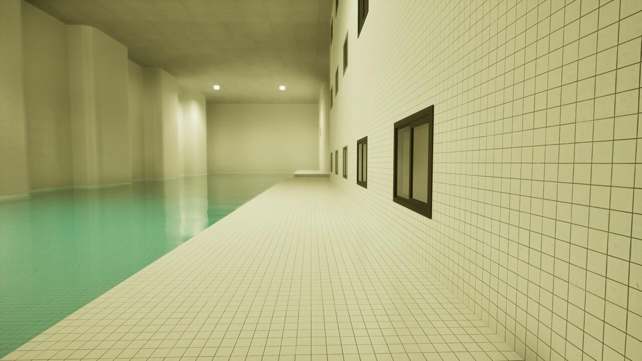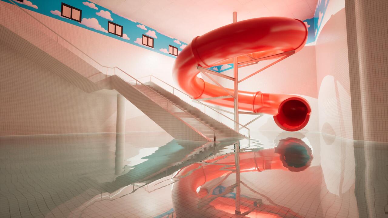 A Dreamcore több fejezetre oszlik, ezek közül viszont jelenleg csak kettő érhető el jelen pillanatban, a trófealista is rájuk korlátozódik. Az első a listáról a Dreampools, amely a már említett medencés téma köré épül. Egy hatalmas labirintusban mozoghatunk, amelyben rengeteg medence található. Ez egyfelől lehet rendkívül nyugtató, relaxációs élmény (nem véletlenül kapott saját zenei mellékágat a vaporwave zsánerben), másrészt roppantmód nyomasztó is, ha az ember belemerül (szó szerint). Az első percekben még hajtott a felfedezés öröme, és érdeklődve próbáltam kitalálni, hogy mely utak hová vezetnek, hol ágaznak el a vízicsúszdák, és mit jelenthetnek a falakra festett ajtószimbólumok. Aztán az egész elkezdett a bőröm alá kúszni, és rendesen a hideg rázott, hogy egyedül bolyongok egy hatalmas útvesztőben, ahol óriási oszlopok és gondosan kicsempézett falak szegélyezik az utamat.