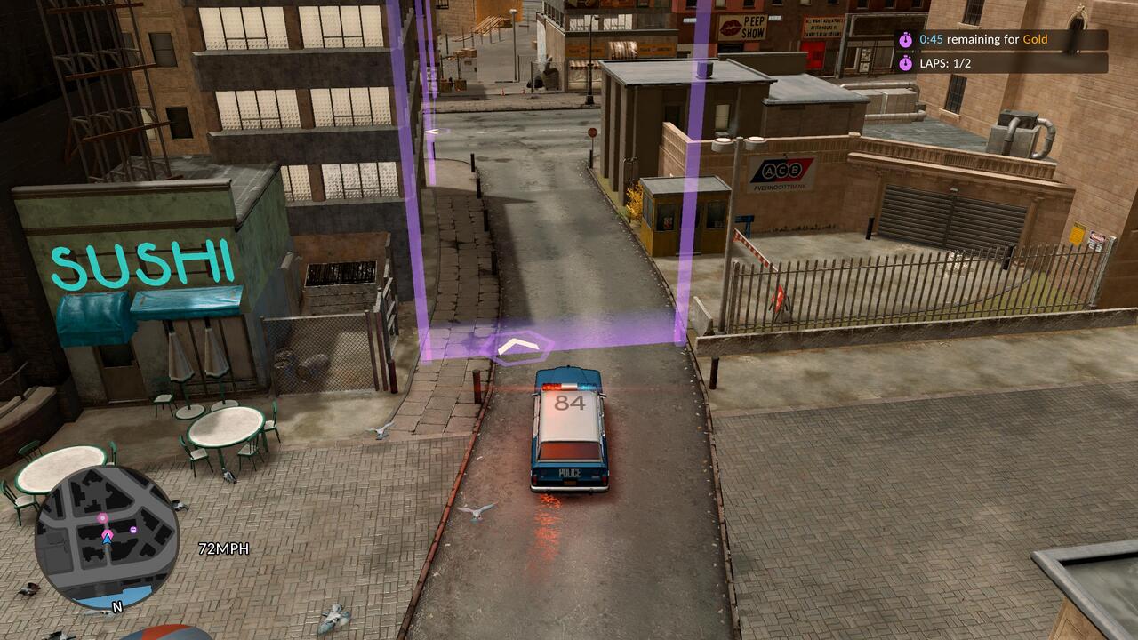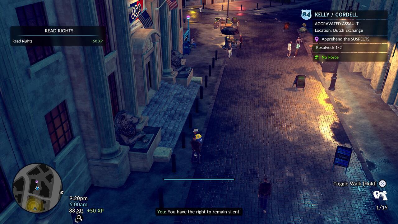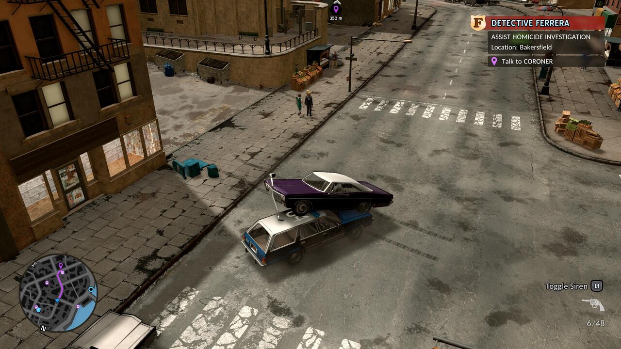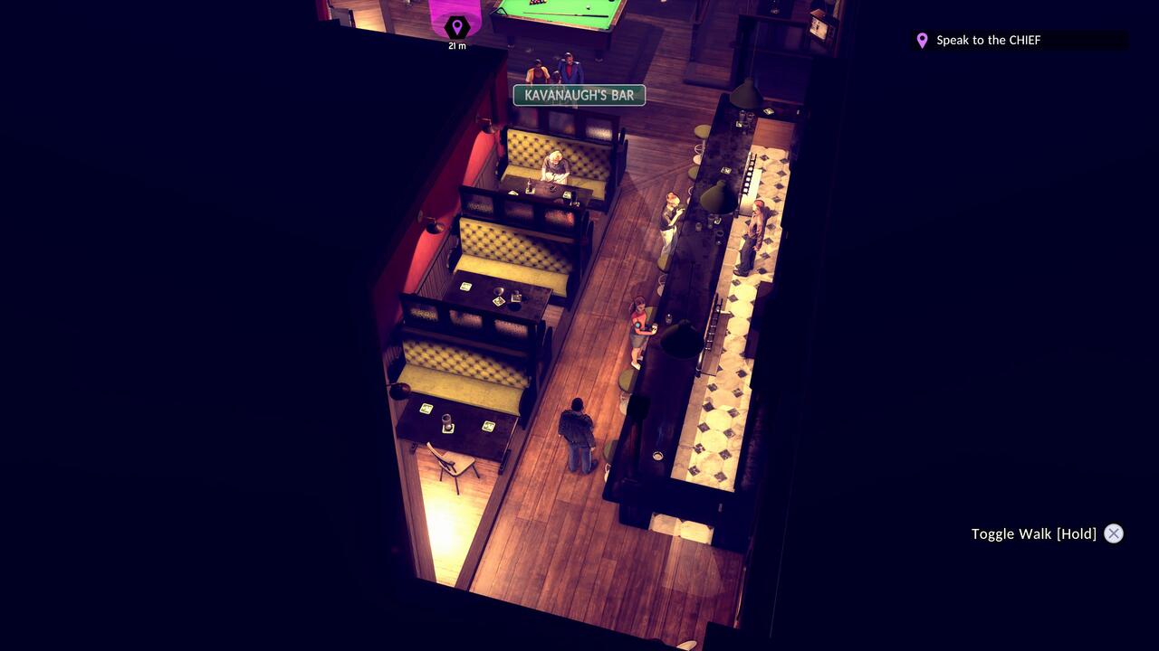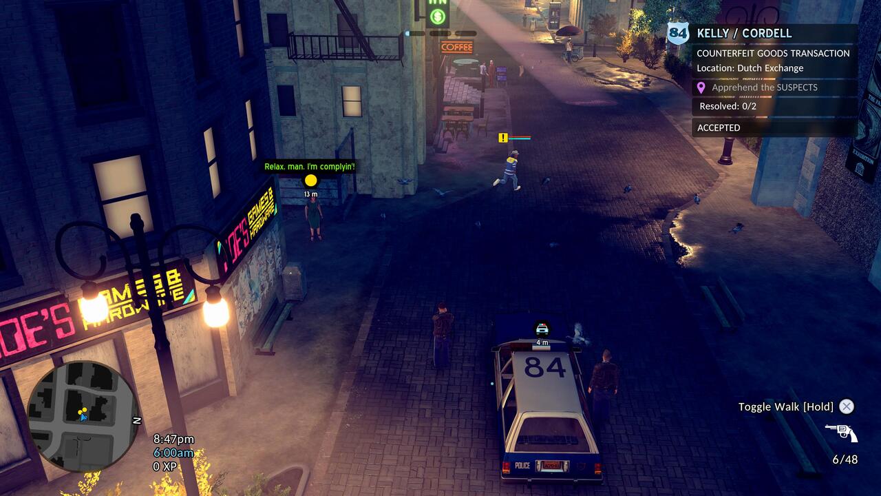 A másik gyenge pont, ami sokkal durvább az autóvezetésnél, az a gunplay. Én PlayStation 5-ön játszottam kontrollerrel, és bizony még célzásasszisztenssel együtt is katasztrófa volt. Az izometrikus kameranézetből fakadóan eleve nehézkes kissé a célzás, de e mellé még a célkereszt megfelelő helyre juttatása is nehézkes az analóg karral. Ha mozog a célpont, akkor pedig konkrétan esélytelen... Ezzel együtt egyébként meglepően jó érzés egy-egy nagyobb shootoutot teljesíteni, bár ezek többségében csak a sztorit előre vivő küldetések során fordulnak elő. Amikor már komolyabb fegyverünk is lesz, nem csak a szolgálati magköpködő, jóval több esélyünk lesz a gazfickók ellen. Az MI azzal együtt, hogy többnyire össze-vissza rohangál feleslegesen a fedezékek között, olykor csinál értelmesnek tűnő dolgokat is: ha a banda egy részét lelőttük, a maradék akár meg is adhatja magát.