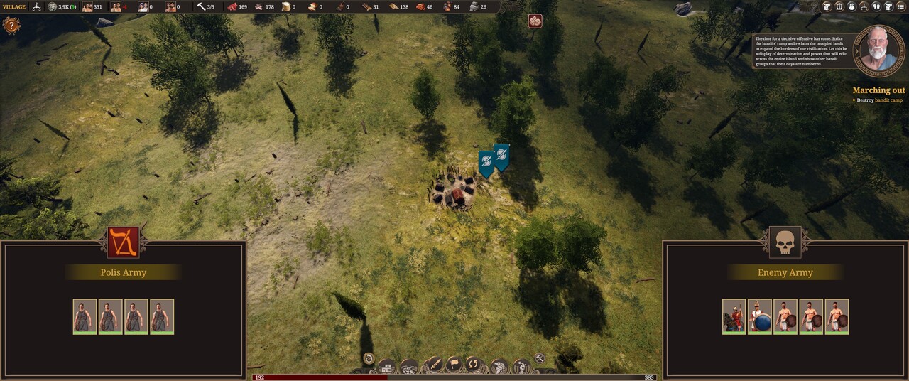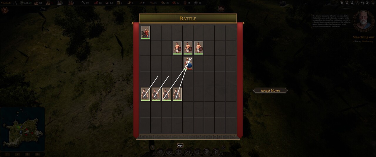 A történelemből tudjuk, hogy az ókori görög városállamok egymással és más népekkel is háborúztak, így a katonásdi jó választásnak tűnik. Mielőbb bárki azt gondolná, nem Total War szintű, többezer fős seregek csatáit fogjuk megvívni a Builders of Greece-ben. Egyféle gyalog, egyféle íjász és egyféle lovas egység választható összesen, ráadásul a csaták nem 3D-ben és nem is valós időben zajlanak, hanem kvázi egy sakktáblán, körökre osztva. Ja, és nem más városállamok, hanem noname fosztogató bandák ellen megy a harc.