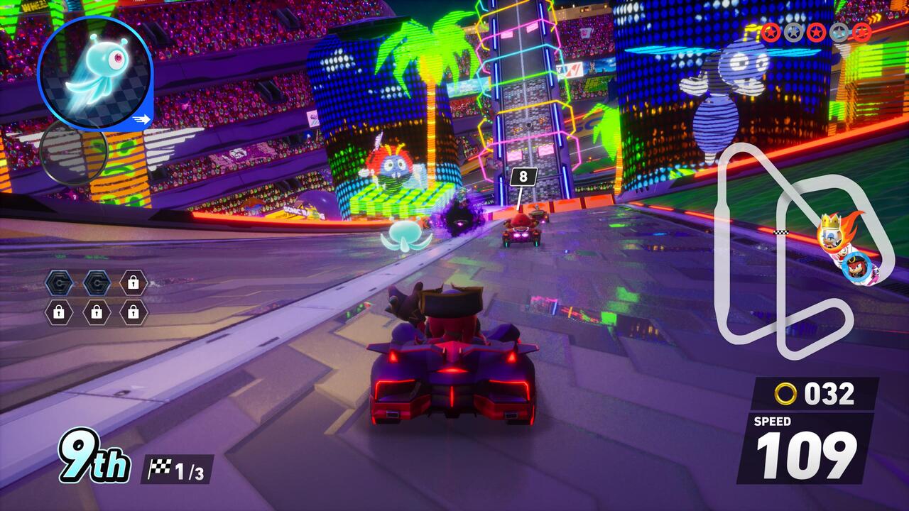 Más léptékű azonban a Sonic Racing CrossWorlds egész felépítése is. Sokkal inkább egy oldskool, lineáris tervezést láthatunk, nyoma sincs a Mario Kart World nyílt világú erőlködésének (ami valljuk be, annyira nem váltotta meg a világot). Az aszfaltcsíkok mind tervezésben, mind a külsőt tekintve nagyon izgalmasak, gyakorlatilag a Sonic franchise minden része megidéződik a helyszíneken. Egyedül talán a mennyiséggel van baj, ugyanis a single player szekciót 7+1 minibajnokság jelenti. Ezek mindegyike négy versenyből áll, amelyből az utolsó egyfajta mixet jelent az első háromból összegyúrva (a plusz egy bajnokság meg a végső nagy megmérettetés, ami akkor nyílik meg, ha a többit már ledaráltuk).