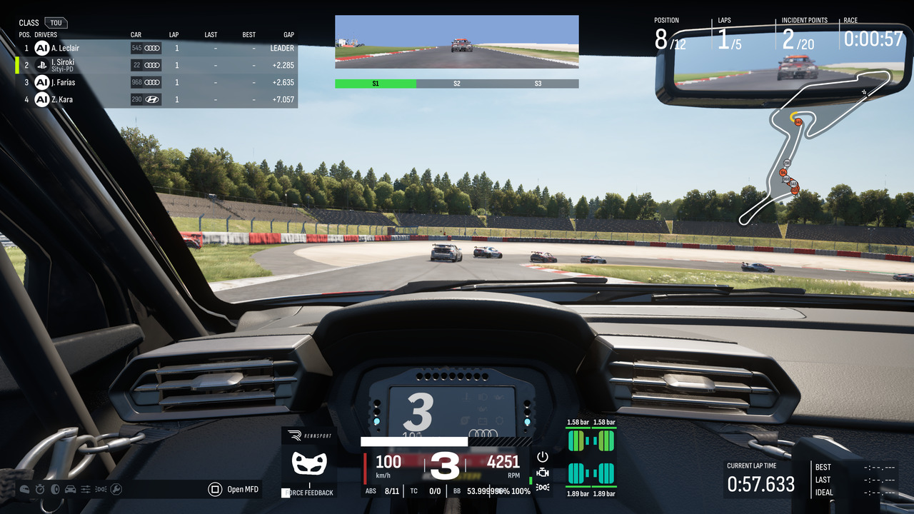 A mesterséges intelligencia szintén egy felemás szörnyeteg lett. Akadnak jó pillanatai, ilyenkor kellemes versenyezni vele, viszont sűrűn egész egyszerűen fogalmatlan. Nem látja a másikat, behúzott kézifékkel megy, túlóvatoskodja a dolgokat – lényegében a Latifi-Maldonado-Sato tengelyen mozogva képes csak versenyezni. Kihívást is pont a közveszélyessége jelent inkább, semmint a gyorsasága. És ha ez még nem elég: az egyjátékos „élményt” lényegében a legkicsontozottabb, legsótlanabb módon tálalja a Rennsport: mehetünk az idő ellen, tolhatunk egy gyors versenyt, illetve futhatunk egy bajnokságot is – ez utóbbiból mindössze három van csak, bár ezen belül 3-4 kategóriát csak sikerült összeizzadni.