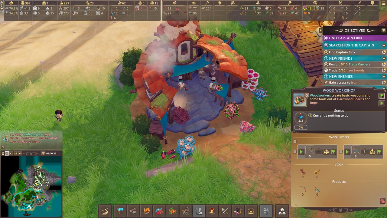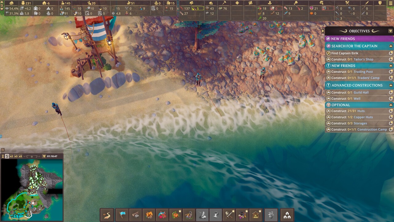 Ahhoz, hogy például felfedezőket küldhessünk a sziget legtávolabbi csücskébe is, szükségük van hátizsákra. A hátizsákot a szabó tudja elkészíteni, de neki szüksége van hozzá cserzett bőrre és szövetre is. Előbbit a vadász készíti el, utóbbit pedig a kelmeszövő. Ám a vadásznak íjra van szüksége, ami a fafeldolgozónál készül, de szükséges hozzá kötél és fa. A kötél ugyebár szintén a kelmeszövőnél készül. Ilyen és ehhez hasonló összefüggések tartják folyamatosan mozgásban kis falucskánk életét. Na és persze a benne lakók. Itt nincsenek naplopók, mindenkinek megvan a maga feladata. A különböző szakmák szakembereket kívánnak, de ők sem mennének semmire, ha nem lennének kőművesek, akik felhúzzák a házakat, nem lennének hordárok, akik szinte szó szerint a vállukon cipelik az egész kolónia sorsát (valójában a nyersanyagokat, szerszámokat, eszközöket, mindent, amit A-ból B-be el kell juttatni). A lakóknak nem csak munkára, de otthonra is szüksége van, így folyamatosan növelnünk kell a lakóházak számát is. Az olyan nehéz fizikai munkák, mint a bányászat, ráadásul külön ételfejadagokat követel meg, így erről is gondoskodnunk kell.