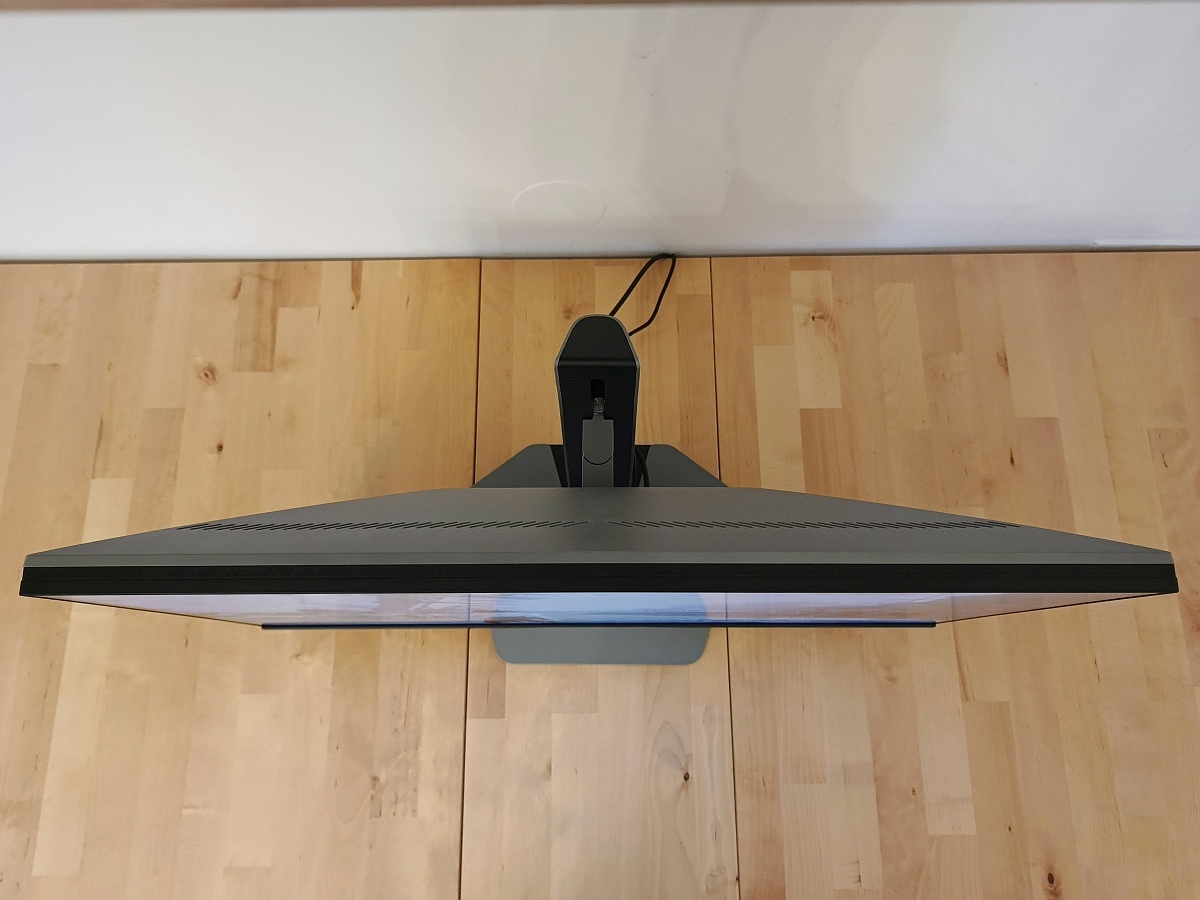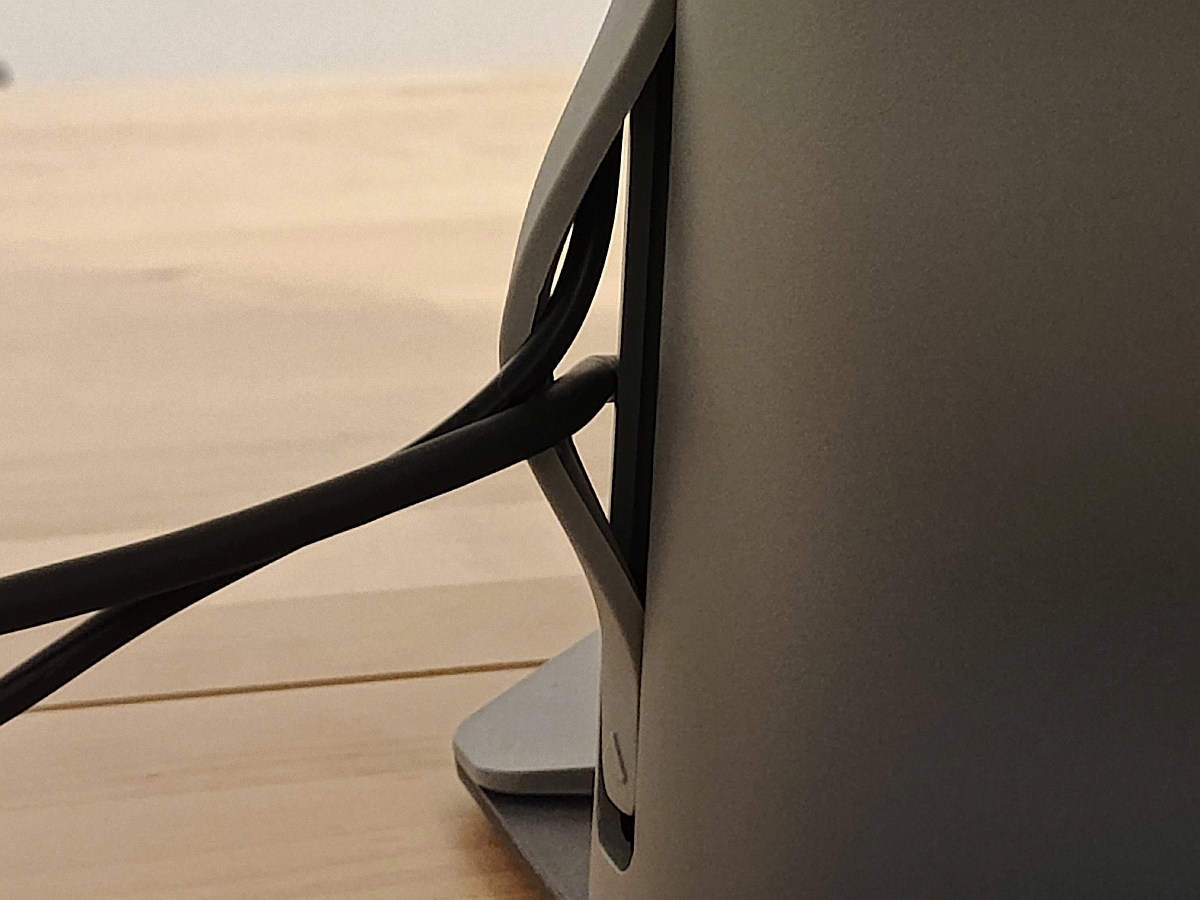 A design alapvetően tetszik. Az, hogy nem a fekete, hanem a sötétszürke a domináns szín, üdítőleg hat, és talán jobban illeszkedik mind egy fehér, mind egy fekete szetthez. És valahol van egy kis Csillagok háborújás birodalmi hangulata is. A kábelelvezetést egy csúsztatható vastag gumiszalaggal oldották meg a mérnökök, ez szerintem zseniális – én sokszor nem férek el a merev műanyag gyűrűkben, keretekben sajnos (3 eszközt használok ugyanarra a monitorra kötve). Kicsit talán vastagabb a megszokottnál, de ez ad neki egy robusztusabb karaktert.