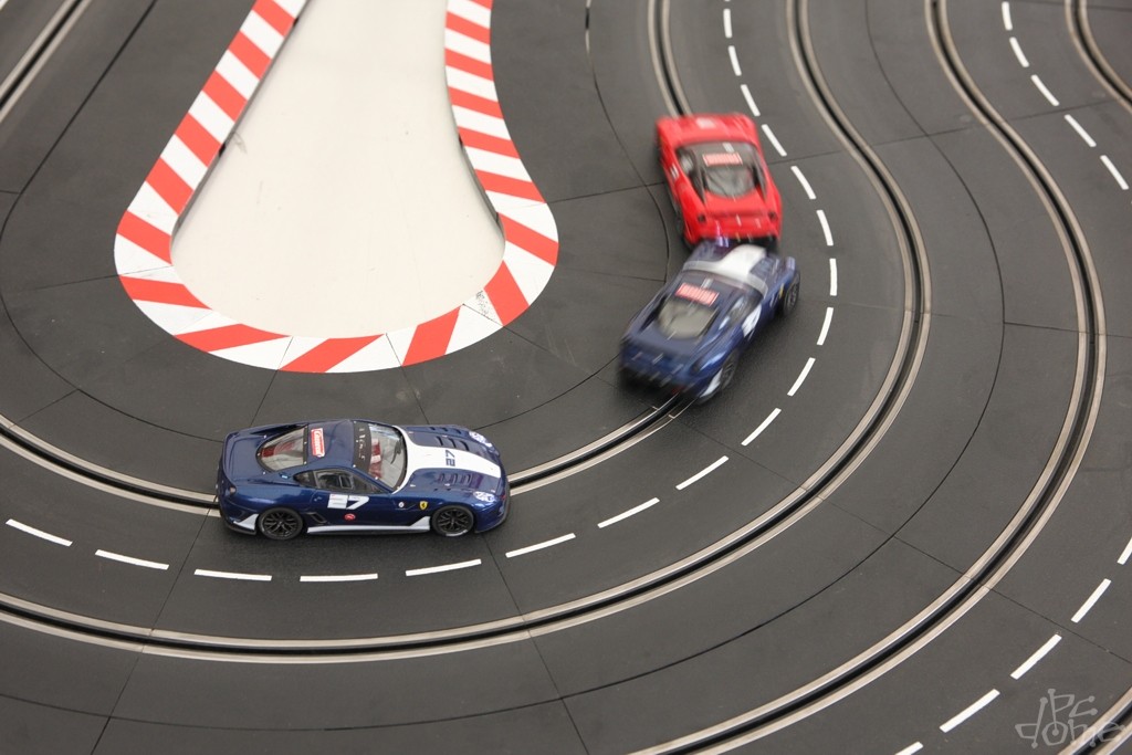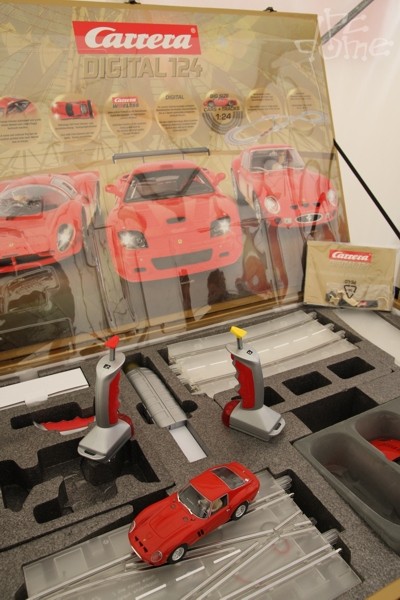 A futamok között pedig bárki kipróbálhatja a Carrera autóversenypályáit, ahol természetesen szintén Ferrari versenyautók mennek körbe-körbe (legalábbis ha megfelelő óvatossággal veszik a kanyarokat a játékosok, máskülönben látványos kicsúszásokat láthatunk itt is, kicsiben :). A kedvünkért még a limitált, 1000 példányban készült különleges Ferrari csomag bőröndjét is kibontották, lentebb abba is belepillanthattok, fekete helyett áttetsző pályák vannak benne.