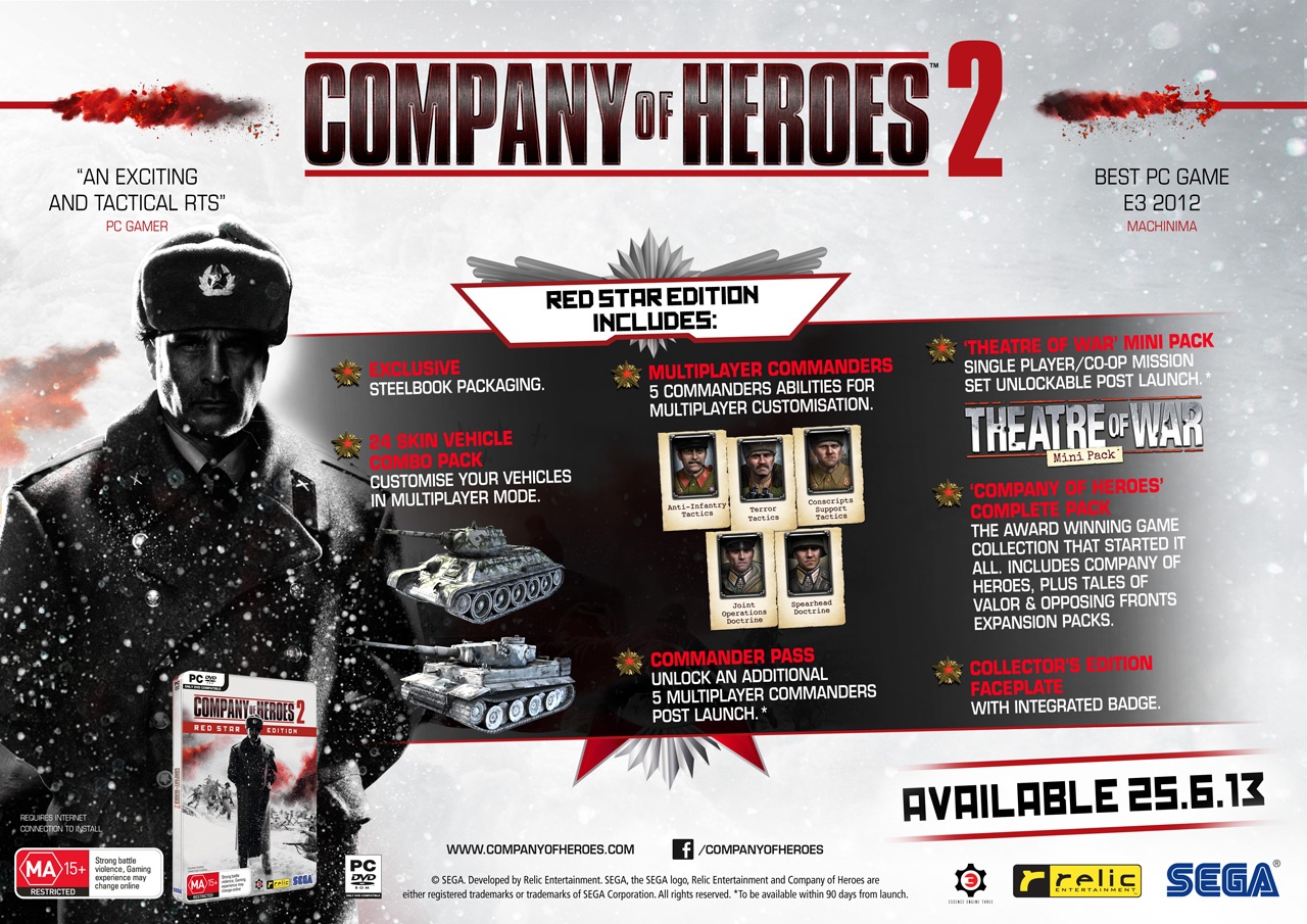 Június 25-én kerül a boltokba a Relic Entertainment új stratégiai játéka, a Company of Heroes 2. Természetesen a standard kiadás mellett elérhető lesz egy különleges gyűjtemény is, amely a Company of Heroes 2 Red Star Edition címet viseli. A csomag a következőket tartalmazza: