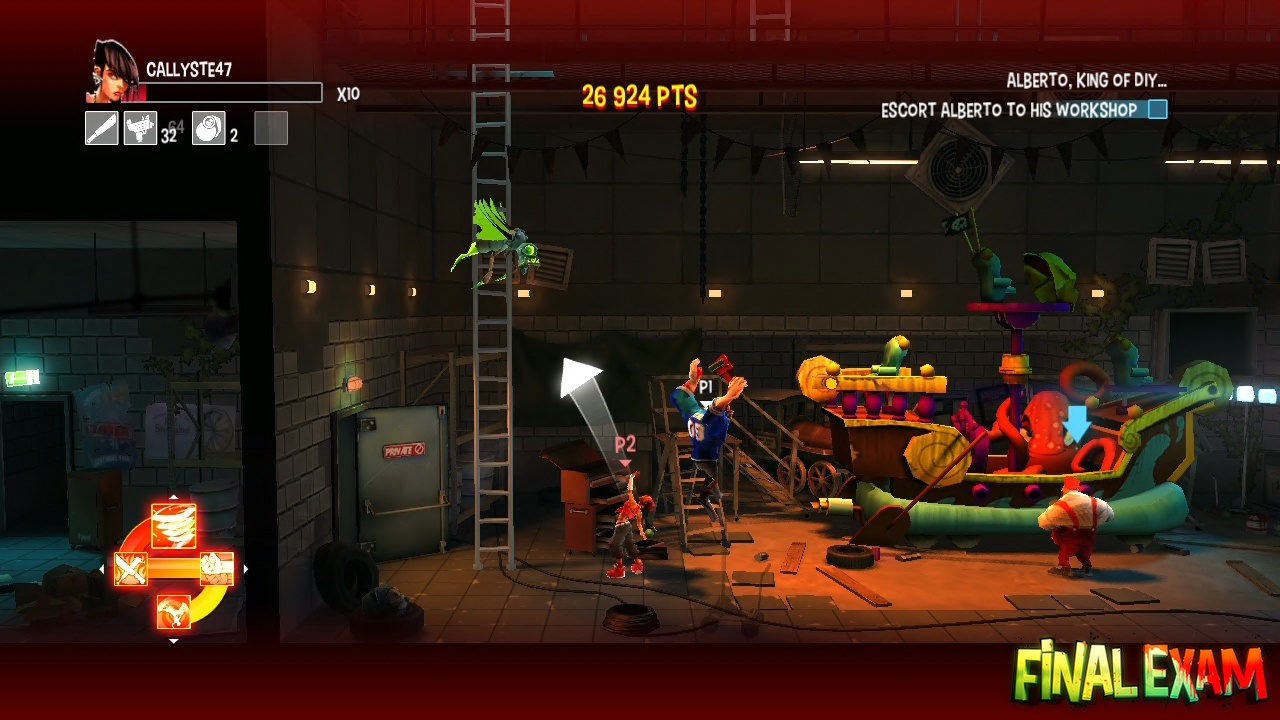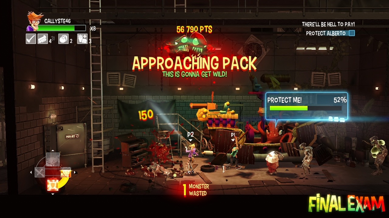 Amint sikerült teljesen elvonatkoztatni az Obscure játékoktól, azonnal feltűnt a Final Exam sajátos bája. Mind a grafika, mind a játékmenet és a szörnyek egy sokkal könnyedebb stílust képviselnek, végig olyan érzésem volt, mintha egy Scooby Doo epizódot néznék, csak épp nem menekülök a szörnyek elől, hanem aprítom azokat. A történet azért most is négy középiskolásról szól, akik mind játszhatóak is lesznek: az izomagyú focista, a lázadó lány, az eminens srác és a kötelező rosszfiú. A demo során egyetlen pályát próbálhattam ki, amely egy elhagyatott(nak tűnő) vidámparkban játszódott, a szereplők közül pedig a focistával apríthattam. Természetesen mindegyik karakter egyedi képességekkel (és saját fegyverekkel) rendelkezik majd, így például a focista leginkább fizikai erejére hagyatkozik. Különleges képessége, hogy képes keresztülrontani bármilyen szörnyetegen, illetve megragadja őket és szó szerint egyik szörnnyel veri el a másikat. Ezek megvalósítása – ahogy az egész játéké – egész viccesre sikerült. A különleges képességek egyébként egy mérce feltöltése után érhetőek el, ehhez pedig csak megfelelő mennyiségű szörnyet kell eltennünk láb alól.