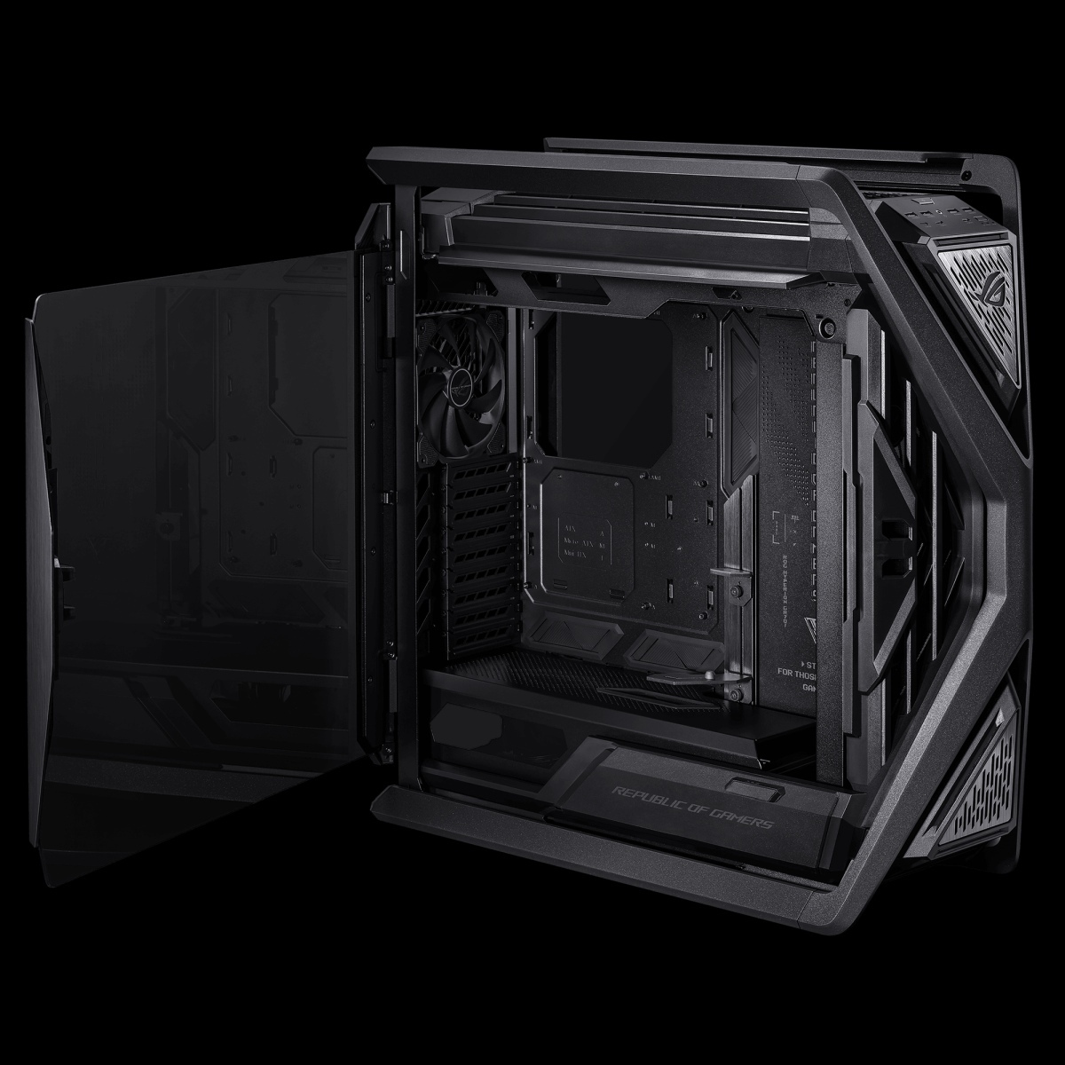 Az igazi nagyágyú pedig a ROG Hyperion GR701 képében csodálható meg. Már a design és az anyaghasználat is mutatja: itt nincs helye komolytalankodásnak. A gigantikus helykínálatot talán mi sem bizonyítja jobban, mint az, hogy akár két darab 420 mm-es radiátor is könnyedén beszerelhető – de akár 460 mm hosszú és 130 mm vastag videókártya is befér, vízszintesen és függőlegesen is, és mivel az ilyen méretű kártyák már igen tekintélyes súllyal is büszkélkednek, az integrált kártyatartó segít az alaplap csatlakozójának tehermentesítésében. A szellőzést és a légmozgást 4 db 140 mm-es gyárilag beszerelt ventilátor helyből segíti, de természetesen további ventilátorhelyek is rendelkezésre állnak. Kell-e említeni, hogy az oldallapok itt is szerszámmentesen kezelhetőek? Az pedig egy nagyon kellemes és egyedi extra, hogy a ház alján egy rejtett rekeszben lehet tárolni a ház kisebb kellékeit: PCIe takarlóemezeket, csavarokat, kábelkötegelőket.