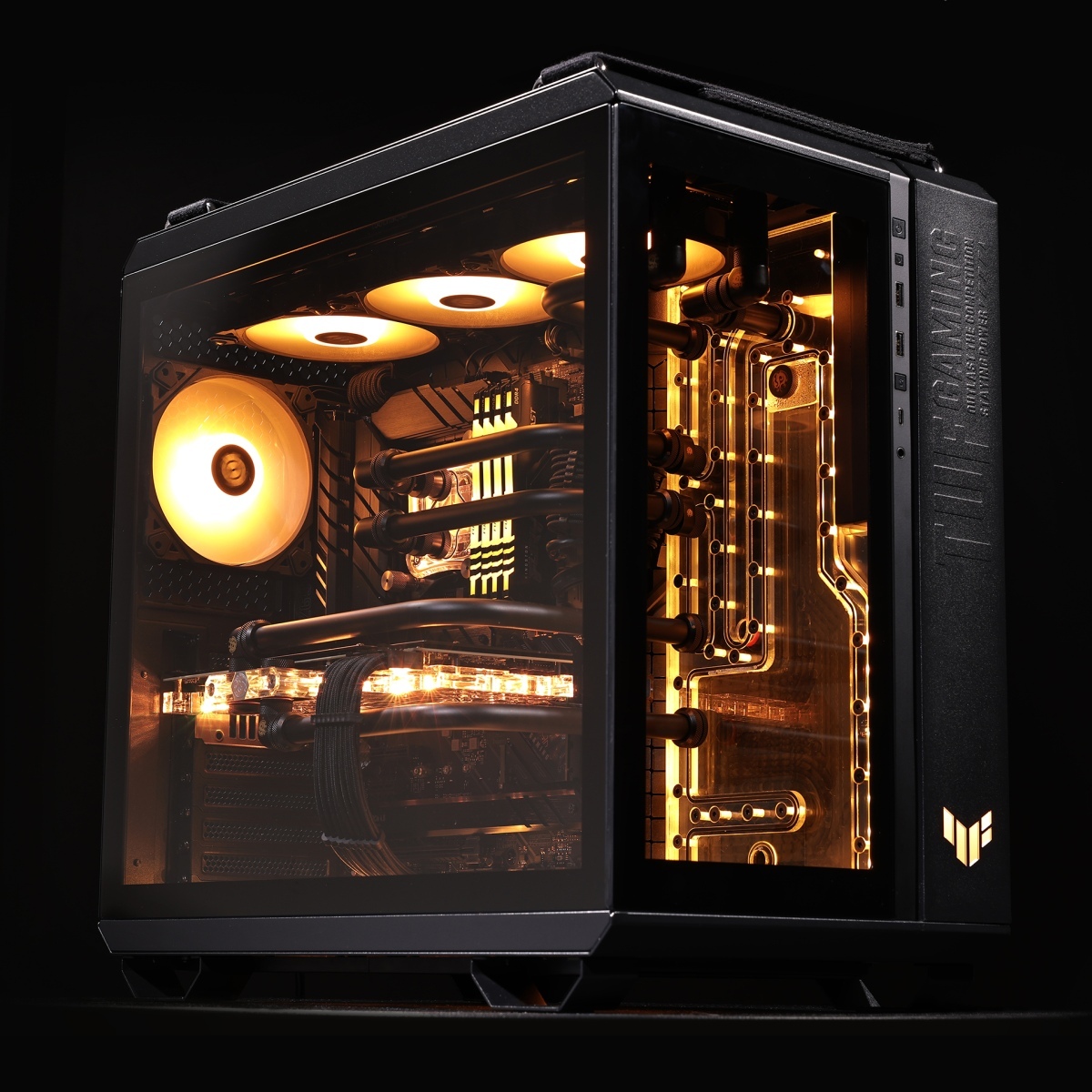 Az „apróságok” után nézzünk nagy, EATX méretű tornyokat – itt van például a TUF Gaming GT502. Ez is inkább az asztal dísze, és nem csak az előre irányított audio és USB portoknak köszönhetően (itt is akad Type-C csatlakozó is)! A szerszámmentesen levehető edzett üveg oldallap mindent megmutat, amit láttatni szeretnél, a moduláris és variálható belső tér pedig sokféle elrendezést tesz lehetővé. A videokártyát szeretnéd a kirakatba tenni? Semmi akadálya, a beépített támasztóval és az elforgatható hátlapi panellel könnyen megteheted. A jobb hűtés érdekében a kompakt vízhűtésed radiátorát inkább az alaplap mögé, állítva tennéd? Sima liba, mivel az alaplapi tálca akkora, hogy két külön kamrát hoz létre belül – így a GPU és a CPU szellőzése egymástól függetleníthető. És bár az online játékok korában ez már talán ritkaságnak számít, de ha mégis egy LAN-party van kinézőben, a ház tetején lévő hevederes fogantyúkkal a mozgatás sem gond.