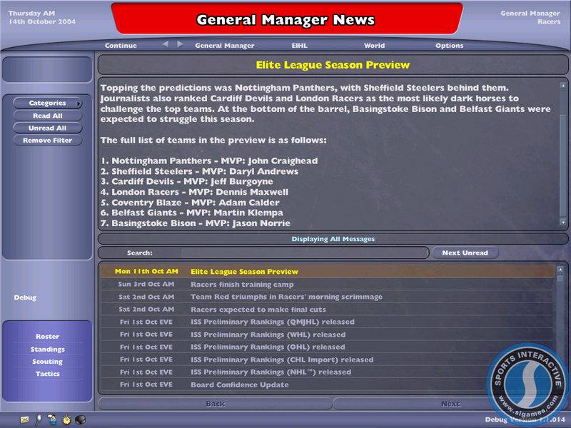 A Sega bejelentette a Sports Interactive legújabb manager játékát a NHL: Eastside Hockey Manager 2005-t, mely idén nyáron visz el bennünket a jéghoki izgalmas világába. Tizenöt bajnokságban vehetünk majd részt, több mint 3200 csapatot és 32000 játékost tartalmaz a program adatbázisa. Sok új lehetőség lesz a programban, szervezhetünk edzőtábort és komolyan alkudozhatunk játékosokra. Kiadtak pár képet is a készülő játékról.